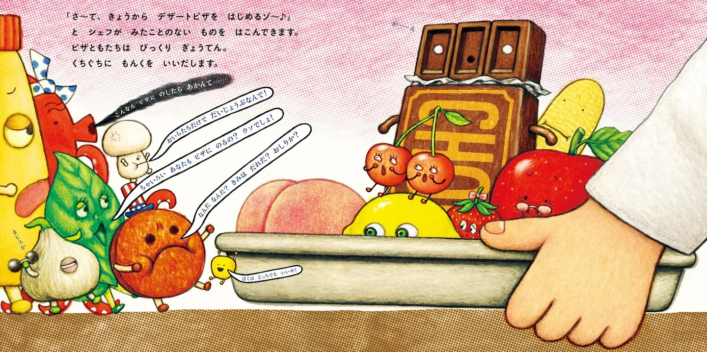 “デザートピザ”にびっくりぎょうてん! ピザにチョコやいちごのトッピングはありなの? ピザのトッピング「ピザとも」たちの結論は…。絵本『ピザとも』 3枚目/全4枚 文芸・カルチャー PR 公開日:2025/3/6