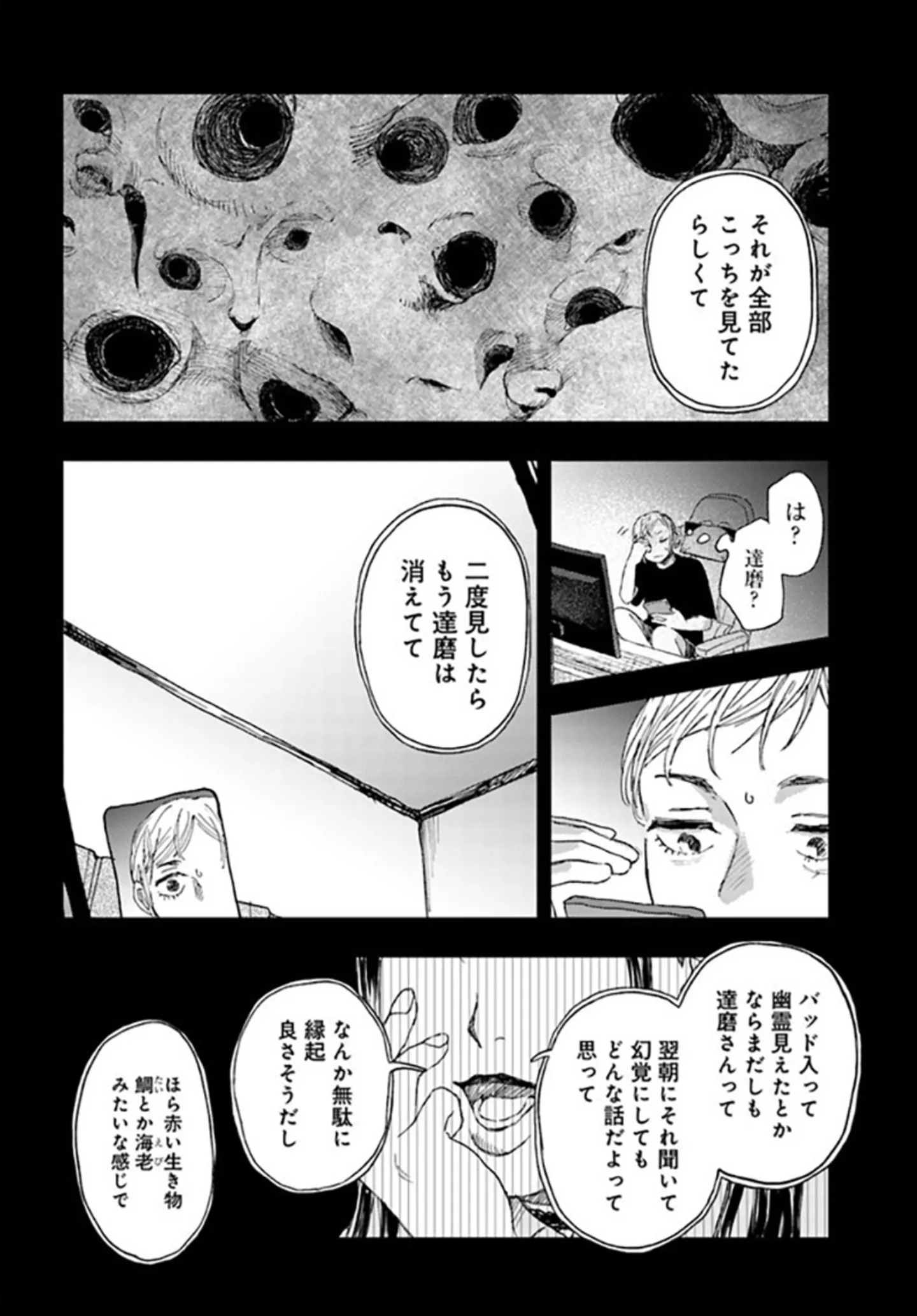 友達とのビデオ通話で寝落ち。1時間後にスマホの画面を覗くと衝撃の映像が…!/コワい話は≠くだけで。 2⑫ マンガ 公開日:2025/3/19 この連載を最初から読む→ <第13回に続く> 本作品をAmazon(電子)で読む > 本作品をRenta!で読む > 本作品をebookjapanで読む > 本作品をBOOK☆WALKERで読む > « 1 2 あわせて読みたい 【漫画】『コワい話は≠くだけで。』を読む 【漫画】『SNS狂の女〜自己顕示欲のバケモノ〜』を読む 【漫画】『厭怪談 -なにかがいる-』を読む 人気のホラー作品を無料で試し読み 前の回 一覧 人気の連載 次の回 コワい話は≠くだけで。 1 (BRIDGE COMICS) Amazon(電子) Amazon 楽天(電子) Renta! ebookjapan ブックライブ コミックシーモア DMMブックス U-NEXT コワい話は≠くだけで。 2 (BRIDGE COMICS) Amazon(電子) Amazon 楽天(電子) コワい話は≠くだけで。 3 (BRIDGE COMICS) Amazon(電子) Amazon 楽天(電子)