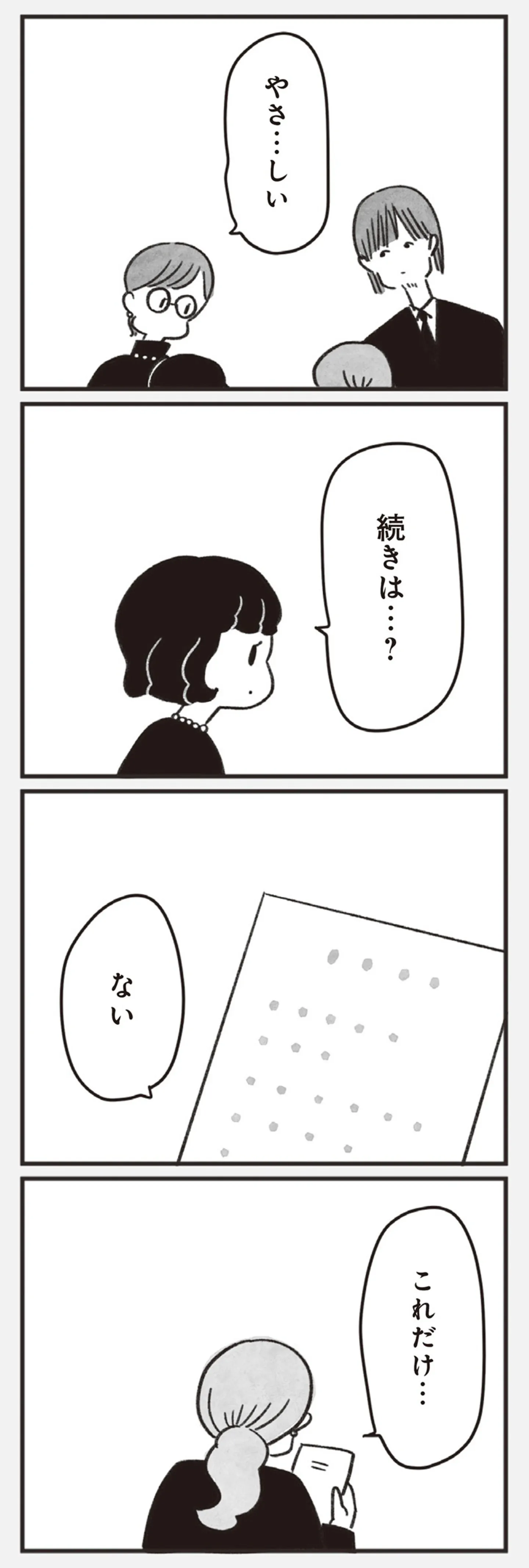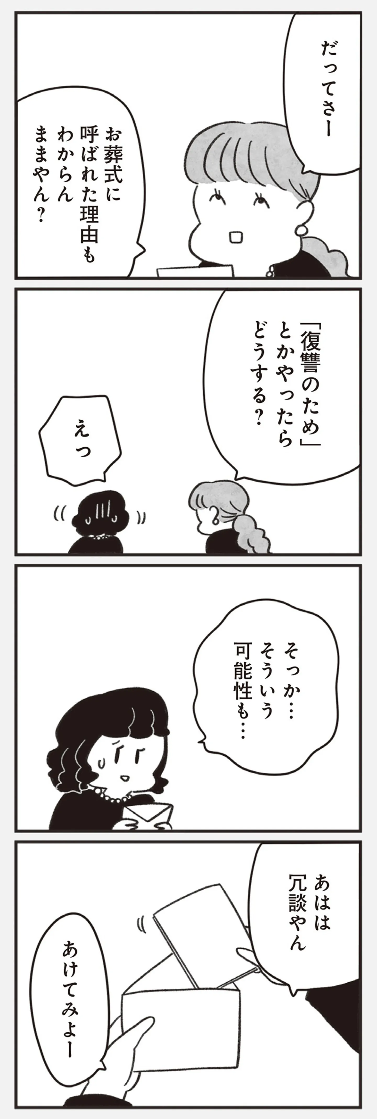 葬儀に招待した高校時代の同級生4人へ故人が用意していた手紙。その中身は…/べつに友達じゃないけど㉒ マンガ 公開日:2025/4/5 この連載を最初から読む→ <第23回に続く> 本作品をAmazon(電子)で読む > 本作品をRenta!で読む > 本作品をebookjapanで読む > 本作品をBOOK☆WALKERで読む > « 1 2 3 あわせて読みたい 【漫画】『べつに友達じゃないけど』を読む 【漫画】『SNS狂の女〜自己顕示欲のバケモノ〜』を読む 【漫画】『40キロ痩せても幸せになれなかった話』を読む 最新マンガと話題の書籍を無料で試し読み! 前の回 一覧 人気の連載 次の回 べつに友達じゃないけど Amazon(電子) Amazon 楽天(電子) Renta! ebookjapan ブックライブ コミックシーモア DMMブックス U-NEXT