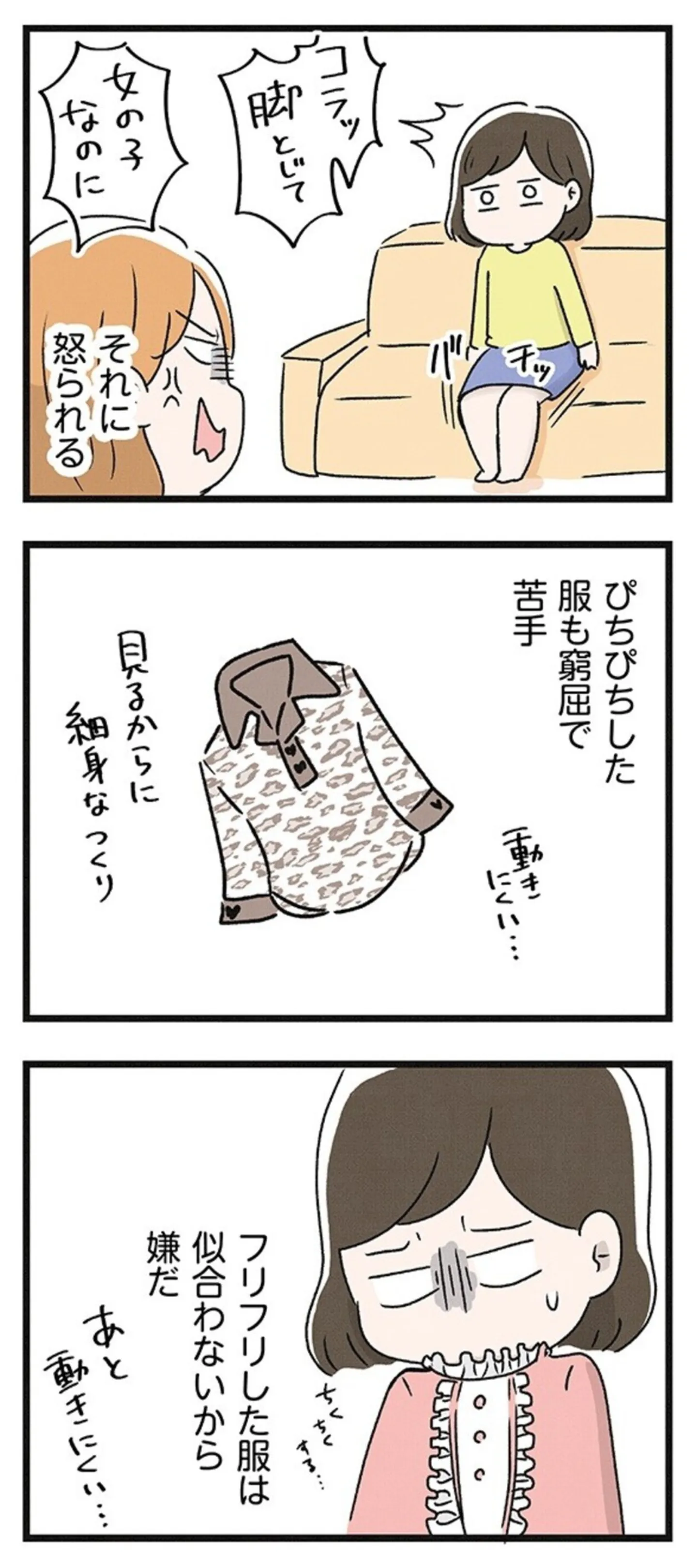 「女の子なのに」いつも服や所作を注意してくる母。男の子だったら怒られなかった?/スカートの呪いが解けるまで⑤ マンガ 公開日:2025/3/19 この連載を最初から読む→ 本作品をAmazon(電子)で読む > 本作品をebookjapanで読む > >> 次のページに続く « 1 2 3 > あわせて読みたい 【漫画】『スカートの呪いが解けるまで 幼少期からの性被害が原因で女らしさ恐怖症になった私』を読む 【漫画】『拾い猫のモチャ』を読む 【漫画】『実家に帰りたくありません』を読む 最新マンガと話題の書籍を無料で試し読み! 前の回 一覧 人気の連載 次の回 スカートの呪いが解けるまで 幼少期からの性被害が原因で女らしさ恐怖症になった私 (はちみつコミックエッセイ) Amazon(電子) Amazon 楽天(電子) ebookjapan ブックライブ コミックシーモア DMMブックス U-NEXT