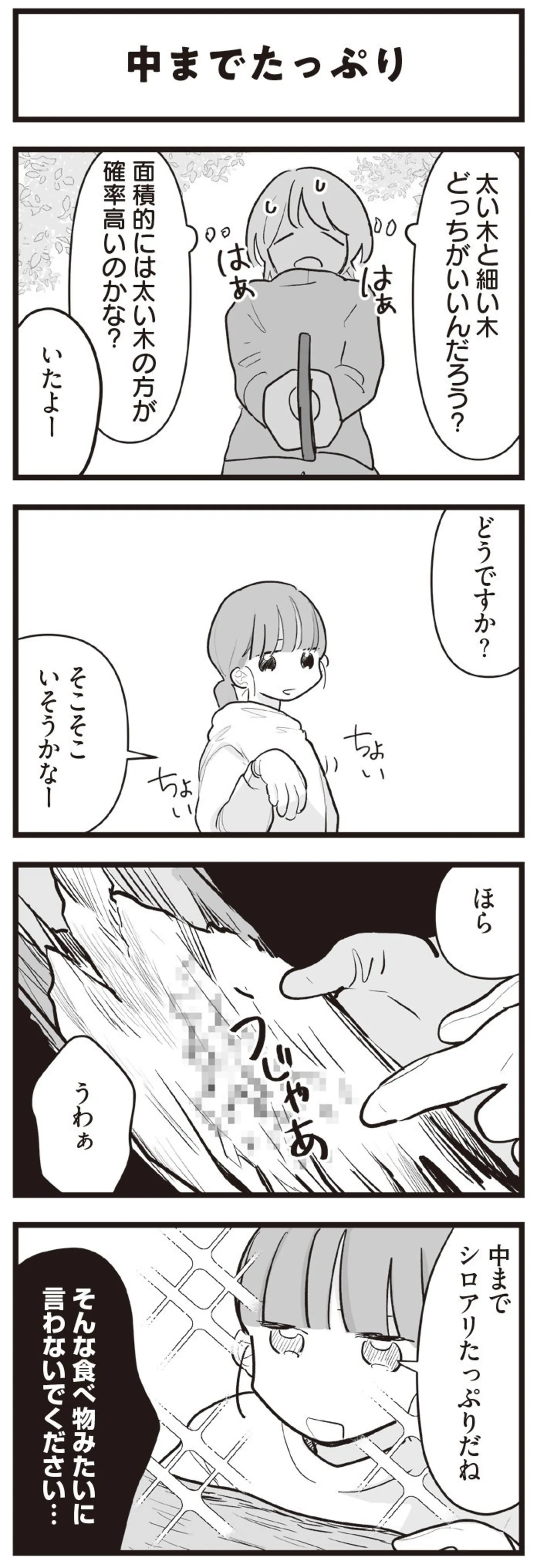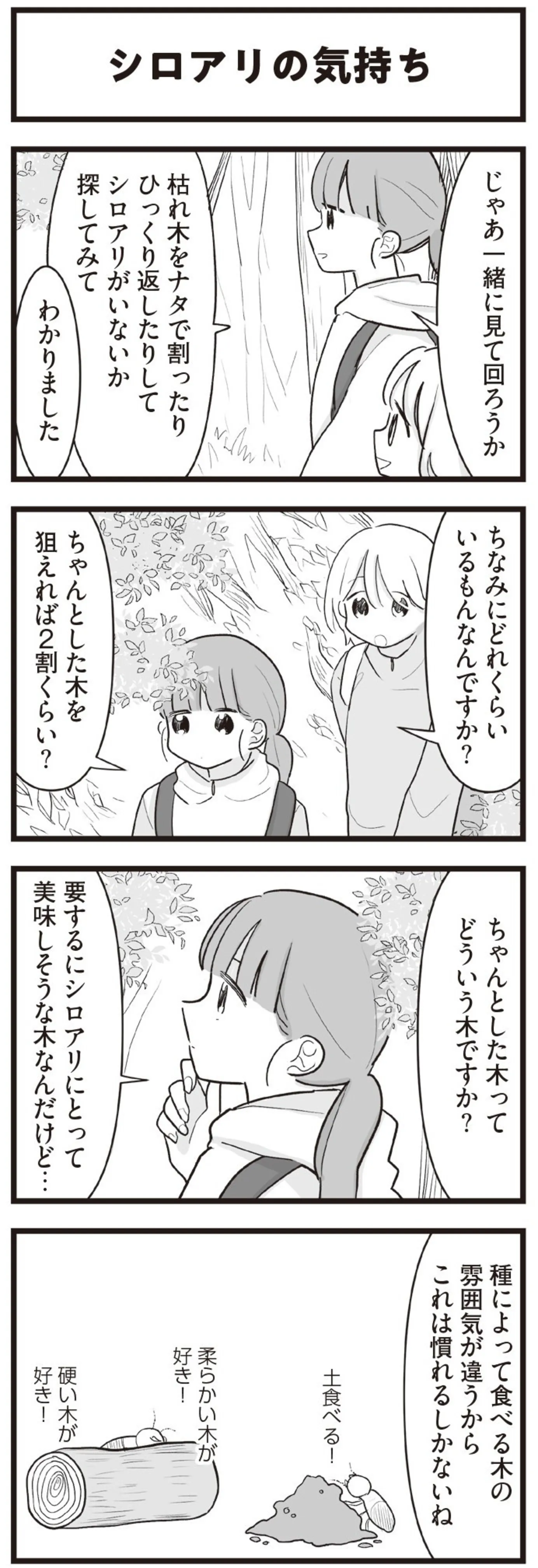 山でのフィールドワークは意外と力仕事! 理系の女子大生が初めてシロアリ採集に挑戦/先輩、実験が終わりません マンガ 公開日:2025/3/26 この連載を最初から読む→ ※経験を積むとシロアリにとって美味しそうな木がわかるようになる 本作品をAmazon(電子)で読む > 本作品をRenta!で読む > >> 次のページに続く « 1 2 3 > あわせて読みたい 【漫画】『先輩、実験が終わりません』を読む 【漫画】『拾い猫のモチャ』を読む 【漫画】『バイトの古森くん』を読む 【漫画】『理系の人々』を読む 【漫画】『ひとりぐらしこそ我が人生』を読む 最新マンガと話題の書籍を無料で試し読み! 前の回 一覧 人気の連載 次の回 先輩、実験が終わりません Amazon(電子) Amazon 楽天(電子) Renta! ebookjapan ブックライブ コミックシーモア DMMブックス U-NEXT