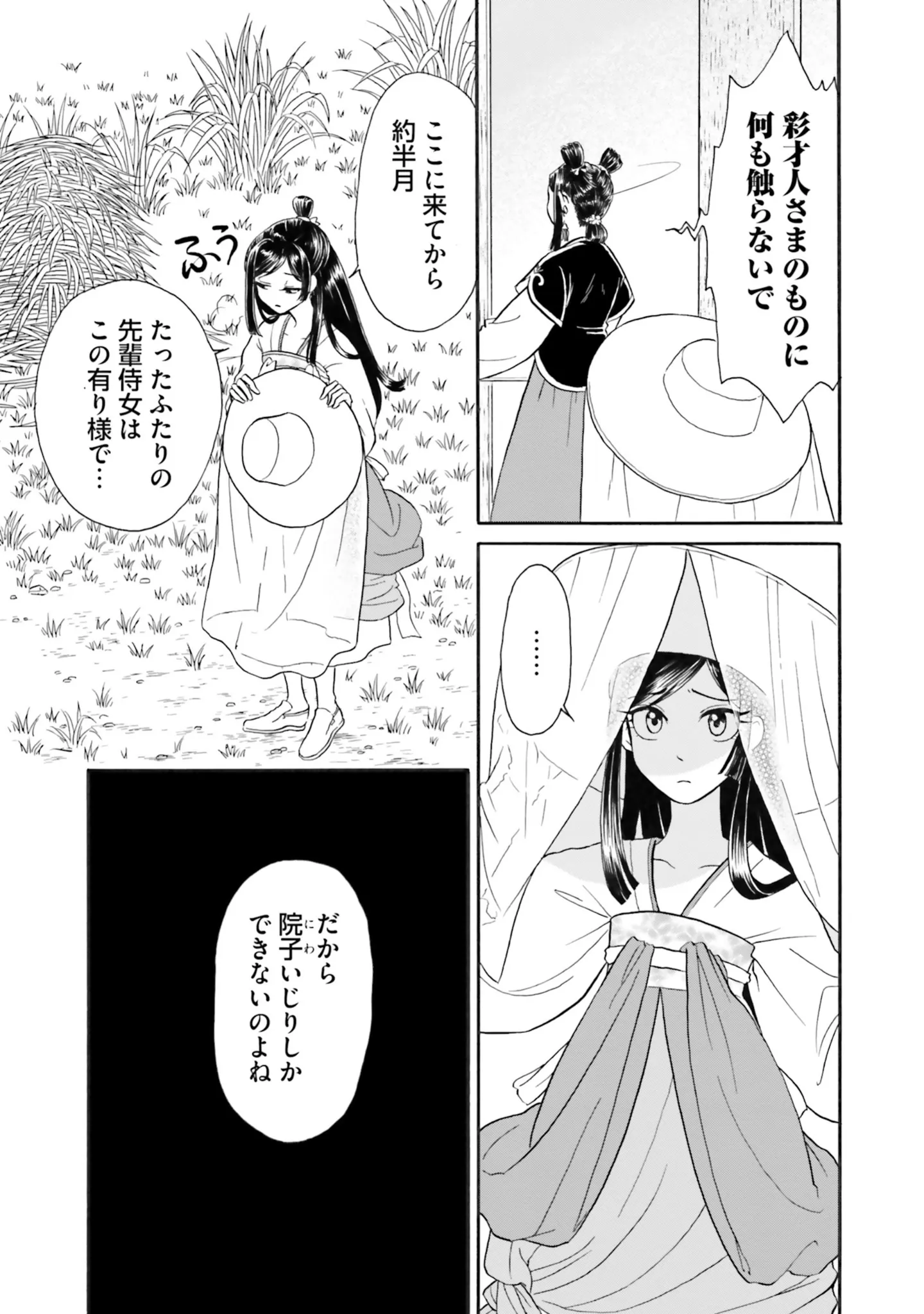 後宮の新入り侍女の仕事は草むしり。なぜか先輩侍女からほかの仕事をさせてもらえない/目が覚めると百年後の後宮でした⑥ マンガ 更新日:2025/4/22 この連載を最初から読む→ <第7回に続く> 本作品をAmazon(電子)で読む > 本作品をRenta!で読む > 本作品をebookjapanで読む > 本作品をBOOK☆WALKERで読む > « 1 2 3 あわせて読みたい 【漫画】『目が覚めると百年後の後宮でした 後宮侍女紅玉』を読む 【漫画】『闘う翼に乾杯を。』を読む 【漫画】『執筆中につき後宮ではお静かに 愛書妃の朱国宮廷抄』を読む 最新マンガと話題の書籍を無料で試し読み! 前の回 一覧 人気の連載 次の回 目が覚めると百年後の後宮でした 後宮侍女紅玉 1 (FLOS COMIC) Amazon(電子) Amazon 楽天(電子) Renta! ebookjapan ブックライブ コミックシーモア DMMブックス U-NEXT 目が覚めると百年後の後宮でした 後宮侍女紅玉 2 (FLOS COMIC) Amazon(電子) Amazon 楽天(電子) 目が覚めると百年後の後宮でした 後宮侍女紅玉 3 (FLOS COMIC) Amazon(電子) Amazon 楽天(電子)