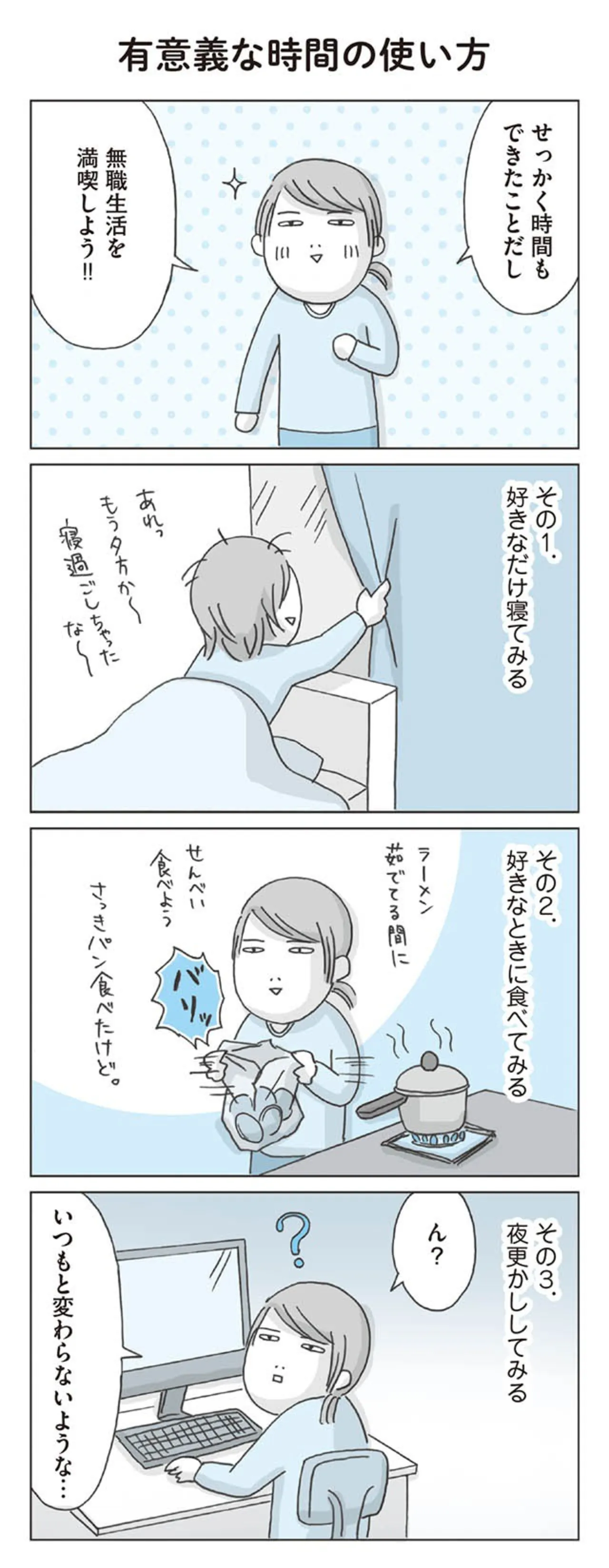 好きなだけ寝て、好きなときに食べる。無職生活を満喫してみて気がついたこと/思いつき無職生活 マンガ 公開日:2025/4/25 この連載を最初から読む→ 本作品をAmazon(電子)で読む > 本作品をRenta!で読む > >> 次のページに続く « 1 2 3 > あわせて読みたい 【漫画】『思いつき無職生活 職なしガールの残念だけど悪くない日々』を読む 【漫画】『拾い猫のモチャ』を読む 【漫画】『身の毛がよだつゾッとした話』を読む 【漫画】『あ、安部礼司です』を読む 【漫画】『離島で研修医やってきました。』を読む 最新マンガと話題の書籍を無料で試し読み! 前の回 一覧 人気の連載 次の回 思いつき無職生活 職なしガールの残念だけど悪くない日々 (コミックエッセイ) Amazon(電子) Amazon 楽天(電子) Renta! ebookjapan ブックライブ コミックシーモア DMMブックス U-NEXT