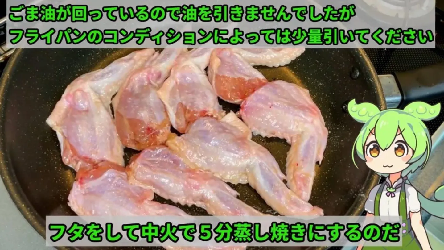 フライパンに手羽先を並べます。油は引かず、皮目を下にします。ふたをして中火で5分蒸し焼きにします。5分経ったら裏返し、再びふたをしてさらに3分焼きます。