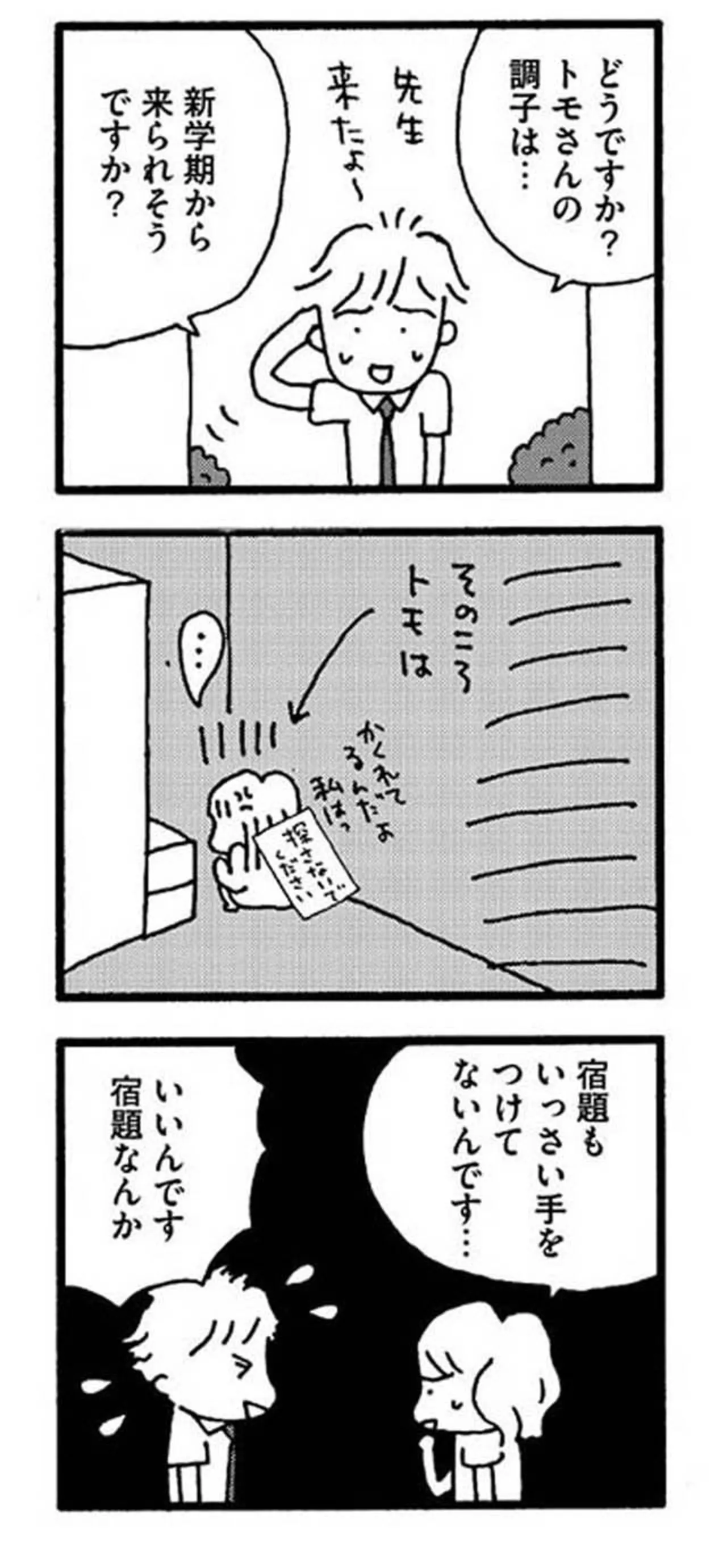 第三者の意見なら聞くかもしれない。不登校の娘をカウンセリングに連れて行くと…/娘が学校に行きません 親子で迷った198日間⑬ マンガ 公開日:2025/4/30 この連載を最初から読む→ 本作品をAmazon(電子)で読む > 本作品をRenta!で読む > >> 次のページに続く « 1 2 3 > あわせて読みたい 【漫画】『娘が学校に行きません 親子で迷った198日間』を読む 【漫画】『スカッと!芹沢くん』を読む 【漫画】『主婦の給料、5億円ほしーー!!!』を読む 最新マンガと話題の書籍を無料で試し読み! 前の回 一覧 人気の連載 次の回 娘が学校に行きません 親子で迷った198日間 (コミックエッセイ) Amazon(電子) Amazon 楽天(電子) Renta! ebookjapan ブックライブ コミックシーモア DMMブックス U-NEXT