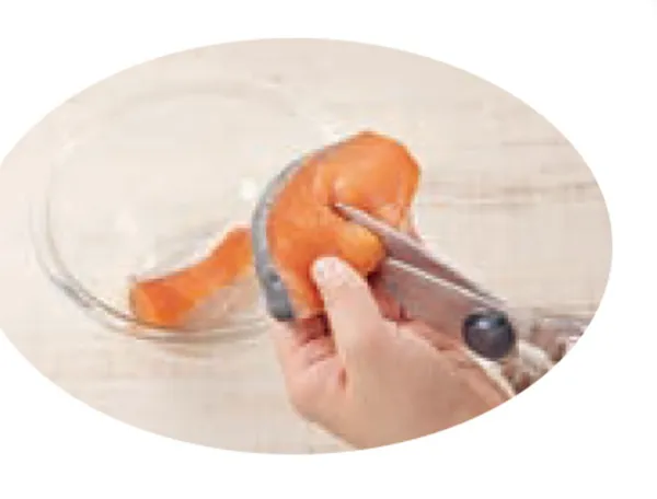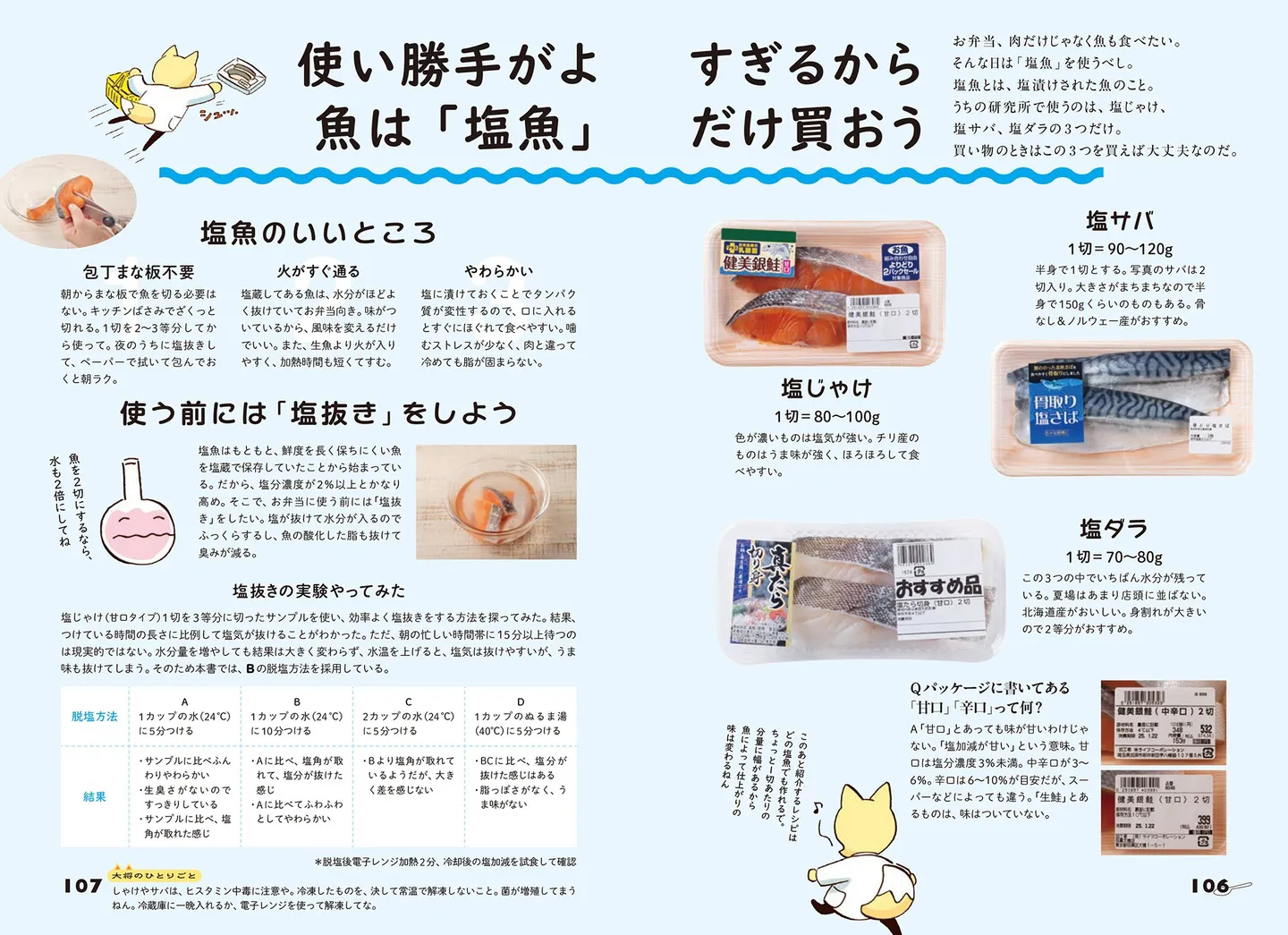 塩魚はもともと、鮮度を長く保ちにくい魚を塩蔵で保存していたことから始まっている。だから、塩分濃度が2%以上とかなり高め。そこで、お弁当に使う前には「塩抜き」をしたい。塩が抜けて水分が入るのでふっくらするし、魚の酸化した脂も抜けて臭みが減る。