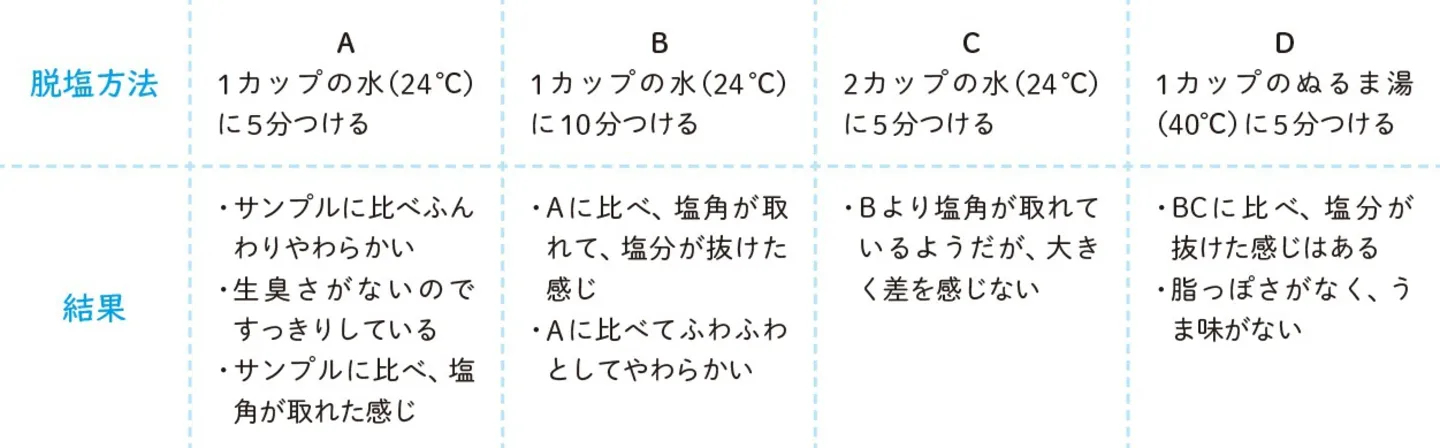 塩じゃけ(甘口タイプ)1切を3等分に切ったサンプルを使い、効率よく塩抜きをする方法を探ってみた。結果、つけている時間の長さに比例して塩気が抜けることがわかった。ただ、朝の忙しい時間帯に15分以上待つのは現実的ではない。水分量を増やしても結果は大きく変わらず、水温を上げると、塩気は抜けやすいが、うま味も抜けてしまう。そのため本書では、Bの脱塩方法を採用している。