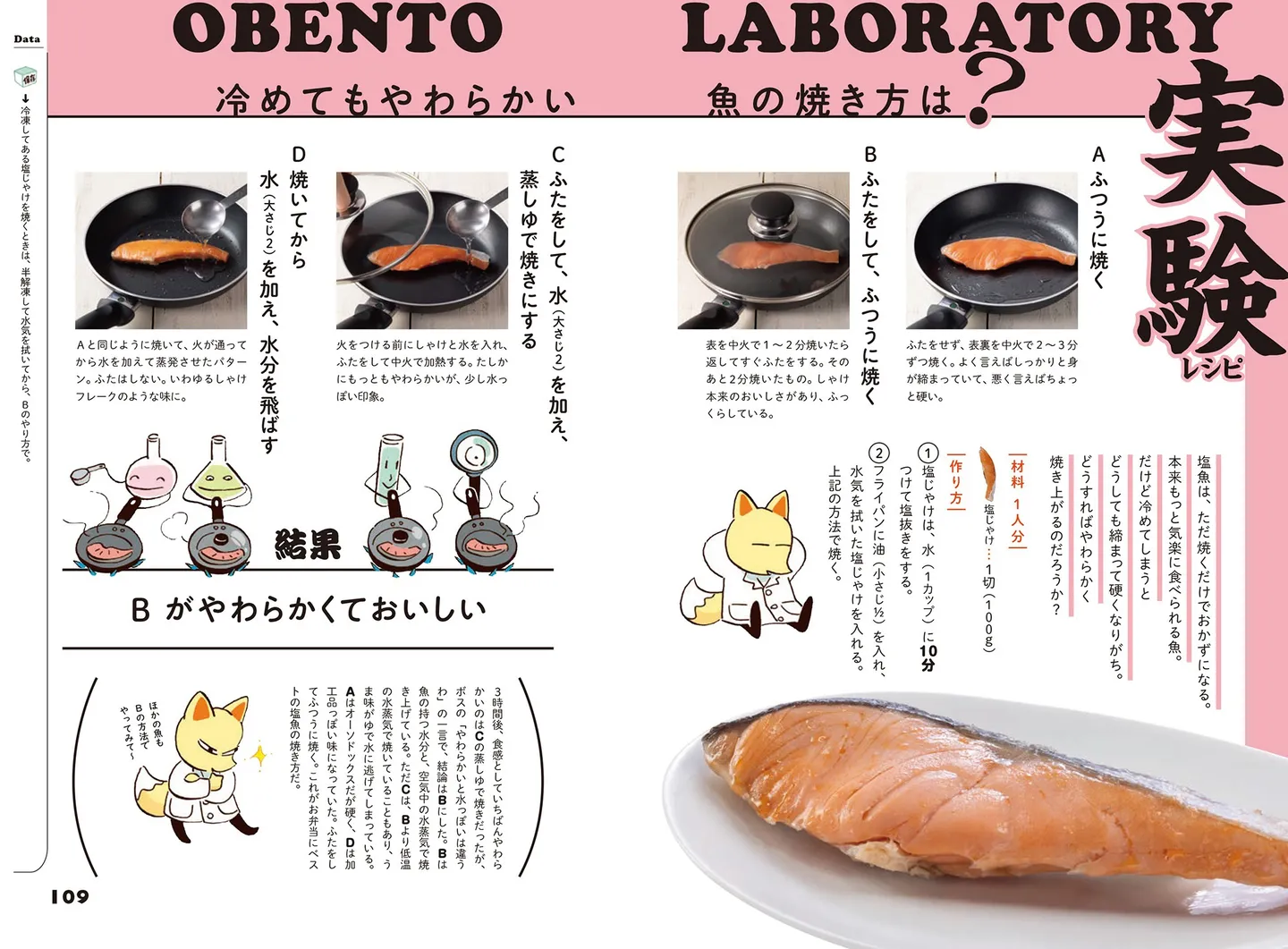 3時間後、食感としていちばんやわらかいのはCの蒸しゆで焼きだったが、ボスの「やわらかいと水っぽいは違うわ」の一言で、結論はBにした。Bは魚の持つ水分と、空気中の水蒸気で焼き上げている。ただCは、Bより低温の水蒸気で焼いていることもあり、うま味がゆで水に逃げてしまっている。Aはオーソドックスだが硬く、Dは加工品っぽい味になっていた。ふたをしてふつうに焼く。これがお弁当にベストの塩魚の焼き方だ。