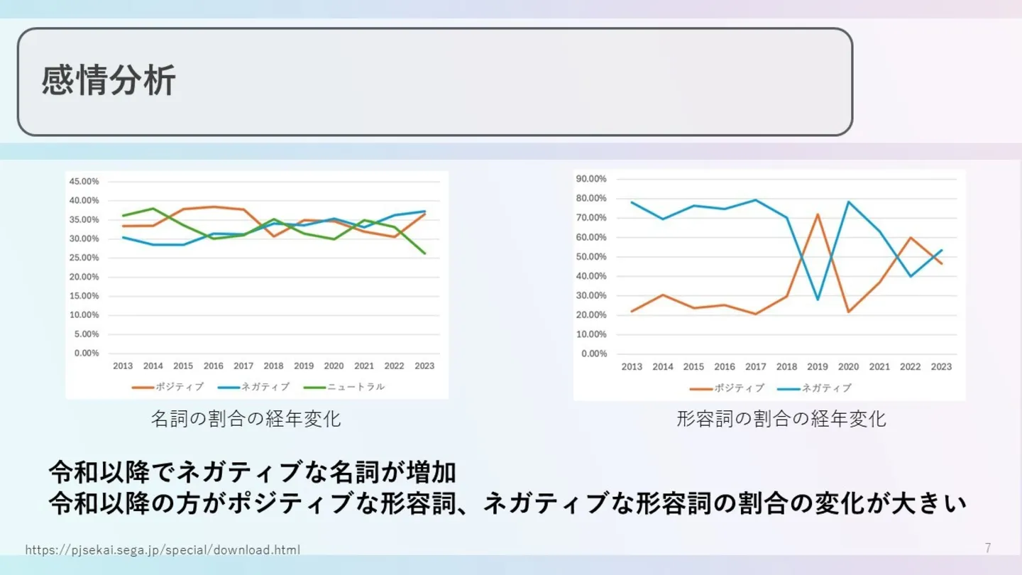 その上で、先ほど仰って頂いた仮説の部分を見てみましょう。続いて約6900件のフレーズにおける歌詞の「名詞」と「形容詞」を抽出し、それらをポジティブ・ネガティブといった感情分析に当てはめてみました。