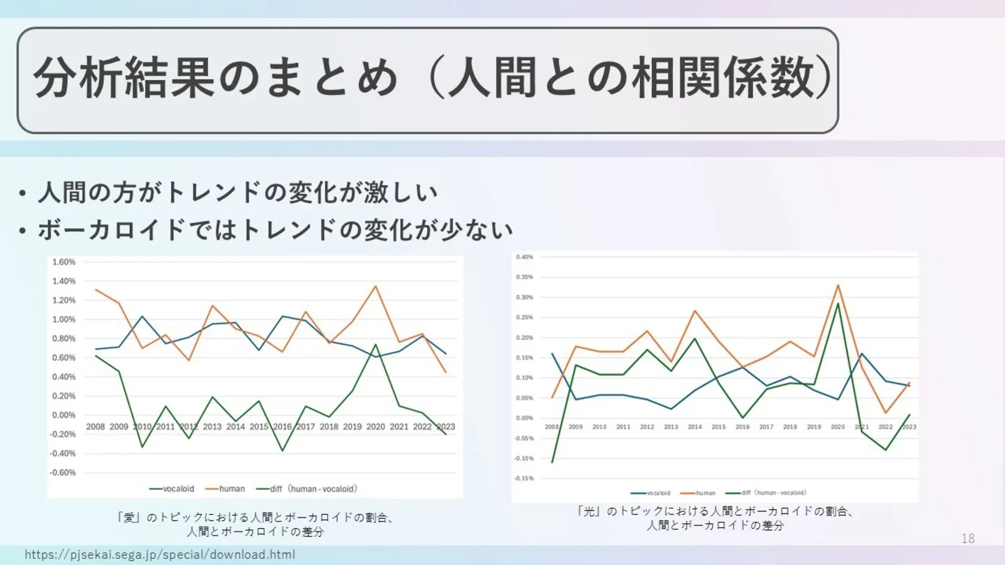 参考文献:横井優,山西良典:ボーカロイドと歌手の人気楽曲の歌詞におけるトピックの差異と変遷の分析,情報処理学会第141回音楽情報科学研究会,2024年8月