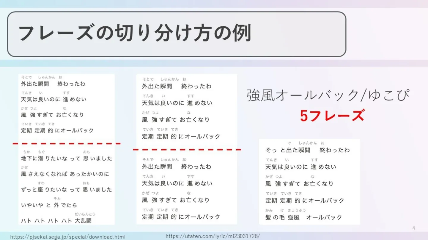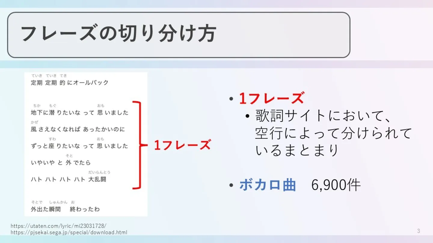 まず今回は550曲のボカロ曲をフレーズ単位に細分化し、約6900件のフレーズでどんな言葉が歌詞によく用いられているかを調査しました。