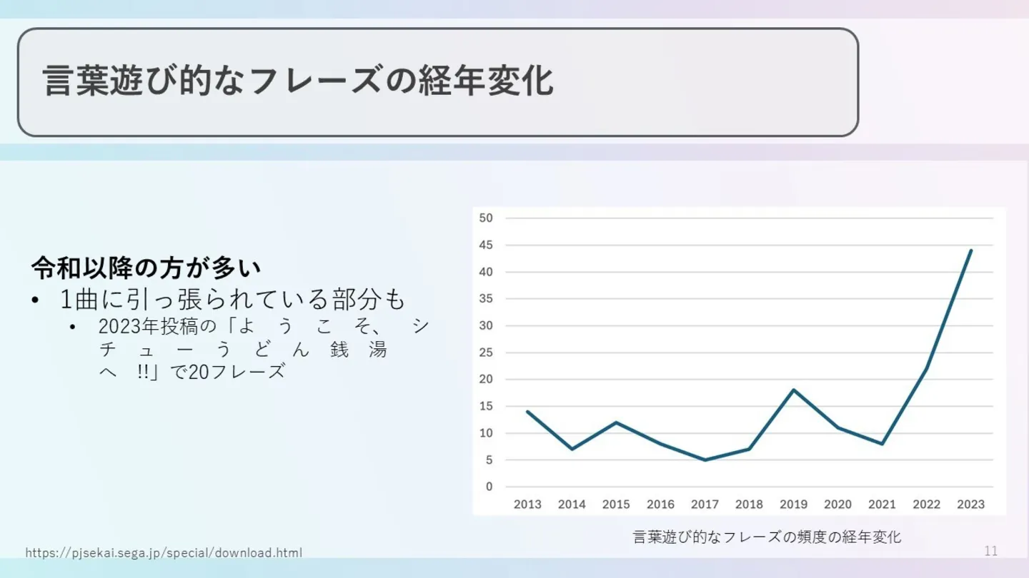 重ねてもう一点興味深い内容としては、同時期から上記のような感情分析には当てはめ辛い「言葉遊び的なフレーズ」も全体的に増加傾向となっているんです。