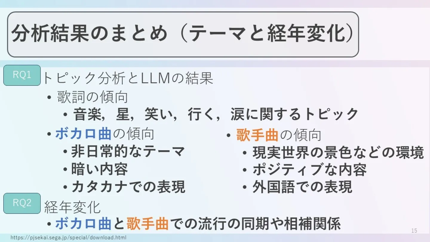 そうですね。先に結論を言ってしまいましたが、順を追ってお話しますね。ボカロ曲の歌詞における傾向の経年変化や、大衆的な楽曲との歌詞傾向の違いについてお話できればと思います。