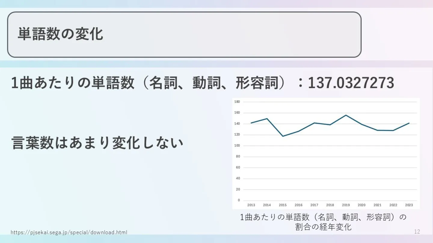 その点で行くと、名詞・動詞・形容詞に限定しての話にはなりますが、1曲辺りの単語数自体には実はあまり変化が見られませんでした。