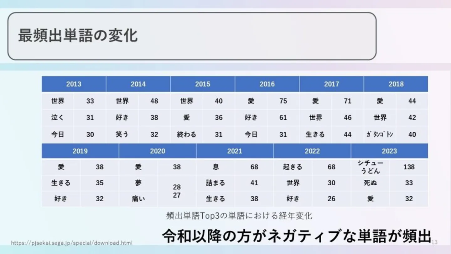 例えば2010年代においては「愛」「今日」「世界」「好き」といったポジティブな単語の方が多く見受けられますが、2020年代突入以降は「痛い」「死ぬ」といったやや強い意味合いのネガティブな単語が散見されます。