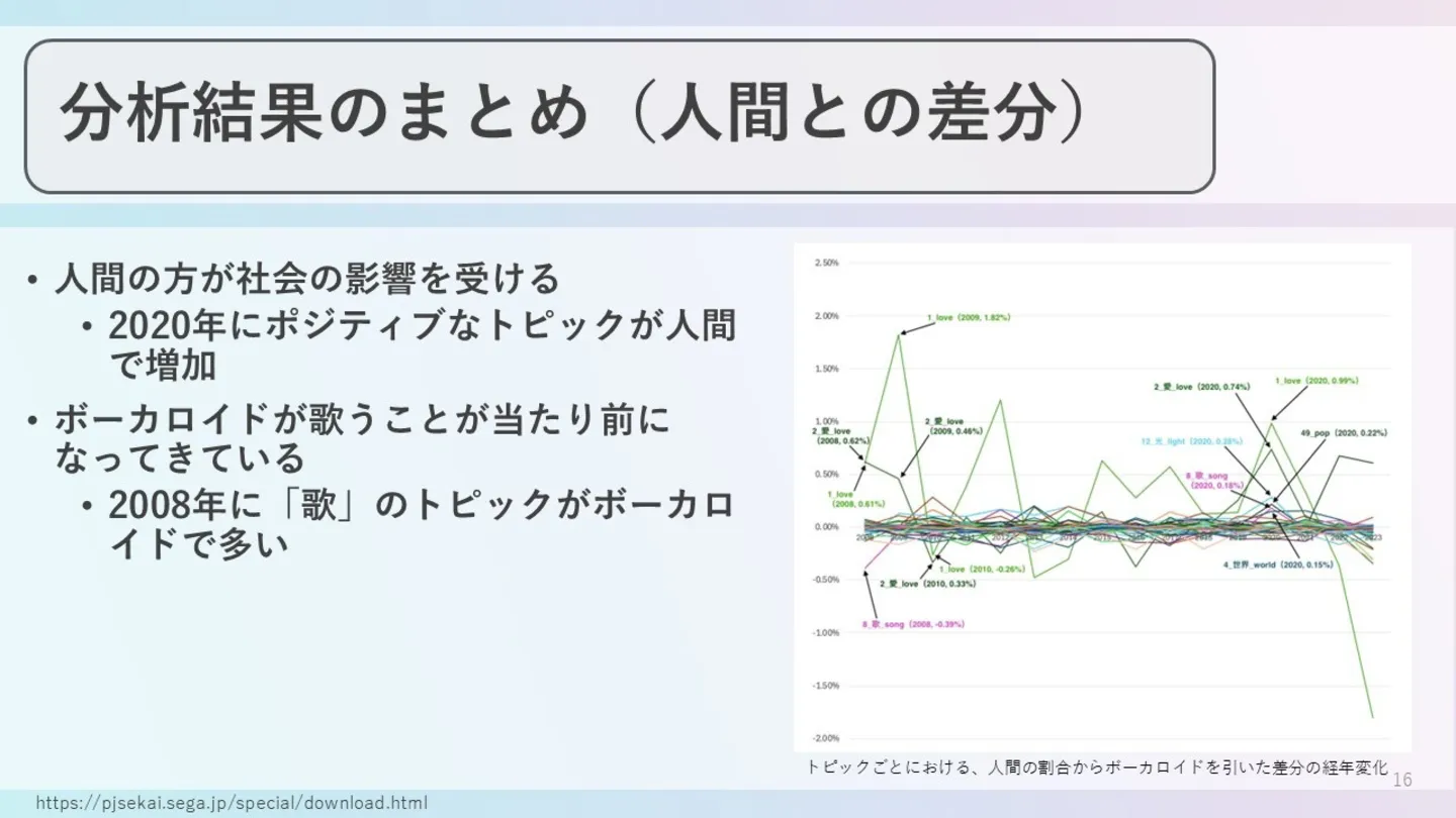 先ほどの調査グラフの2023年の箇所を見て頂くと、「love」をはじめとした一部トピックの数値が大きく下がっている=ボカロ曲の方に多く偏っている傾向が見られています。