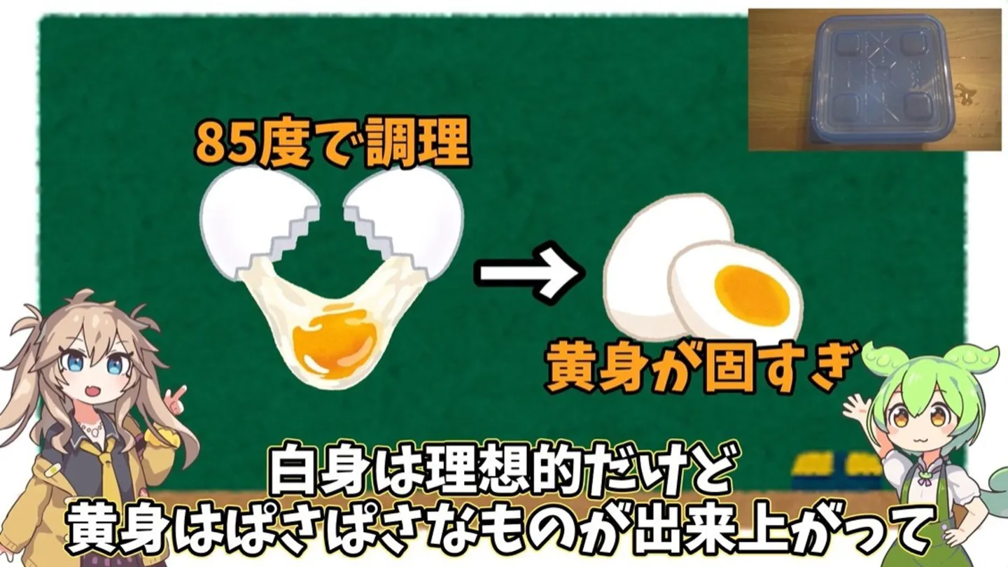 例えば、85度だけで調理すると黄身は固まりすぎてパサパサになってしまいます。