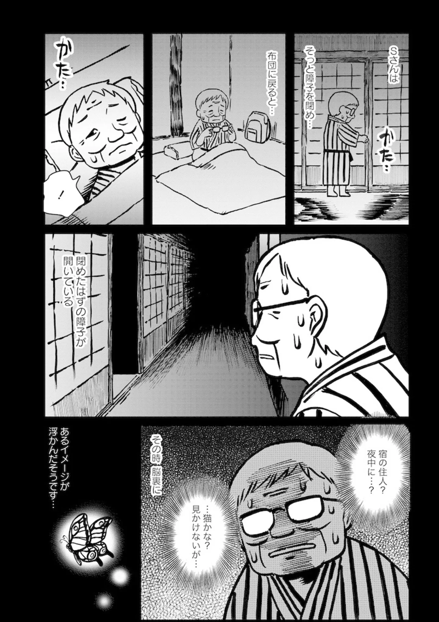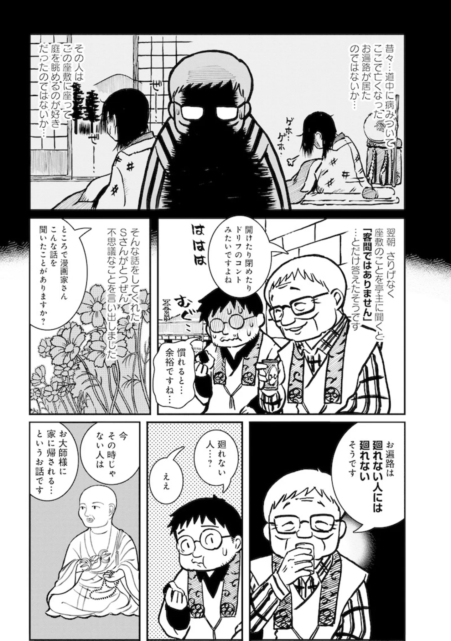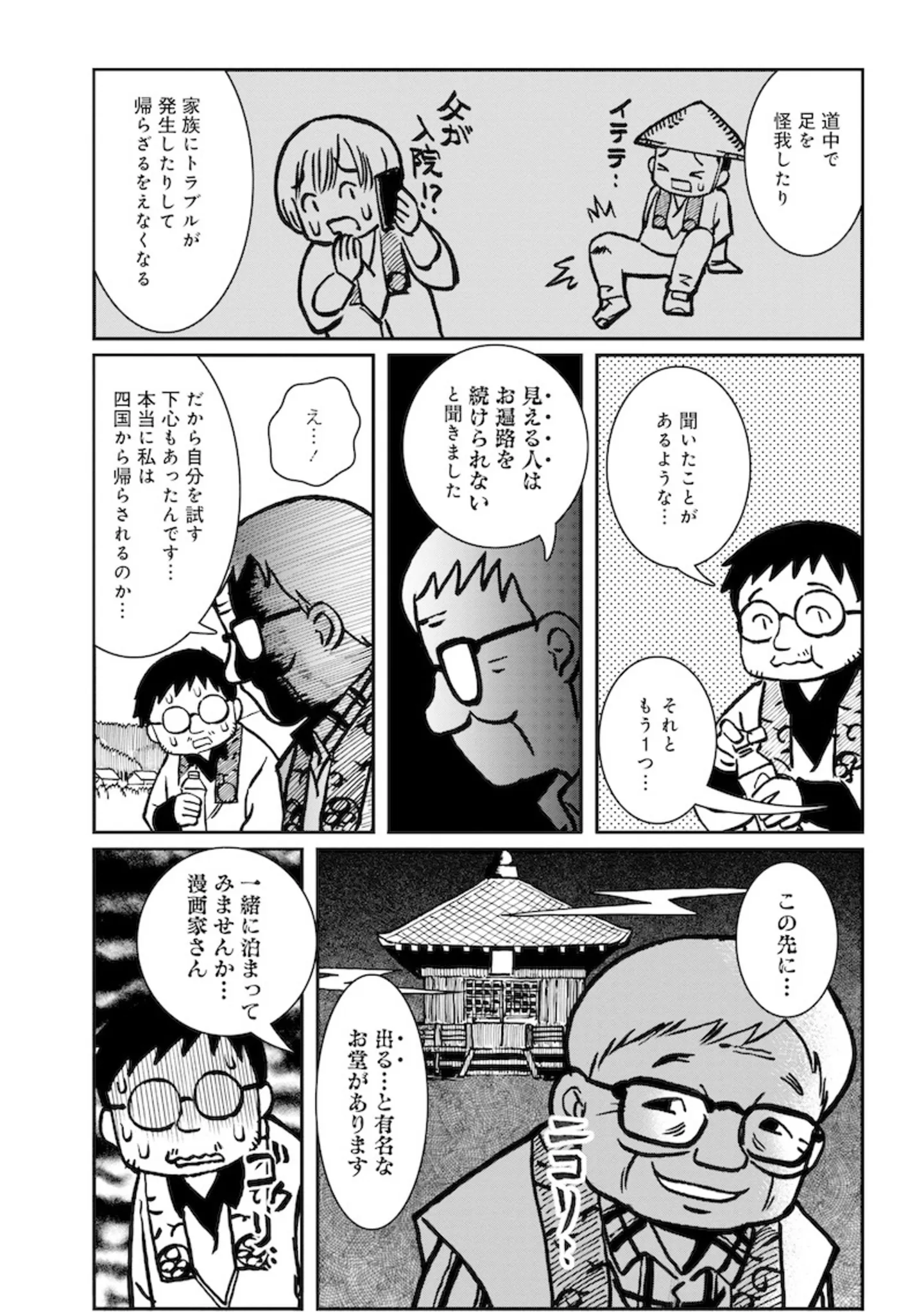 閉めても開く障子。霊感のある男性がその不思議な体験で導き出した考察は…/怪談奇談まみれの四国お遍路⑧ マンガ 公開日:2025/8/2 この連載を最初から読む→ <続きは本書でお楽しみください> 本作品をAmazon(電子)で読む > 本作品をRenta!で読む > 本作品をebookjapanで読む > 本作品をBOOK☆WALKERで読む > « 1 2 3 あわせて読みたい 【漫画】『怪談奇談まみれの四国お遍路』を1話目から読む 【漫画】『障がい者専門風俗嬢のわたし』を読む 【漫画】『カヤちゃんはコワくない』を読む 人気のホラー作品を無料で試し読み 前の回 一覧 人気の連載 次の回 怪談奇談まみれの四国お遍路 (バンブーコミックス エッセイセレクション) Amazon(電子) Amazon 楽天(電子) Renta! ebookjapan ブックライブ コミックシーモア DMMブックス U-NEXT