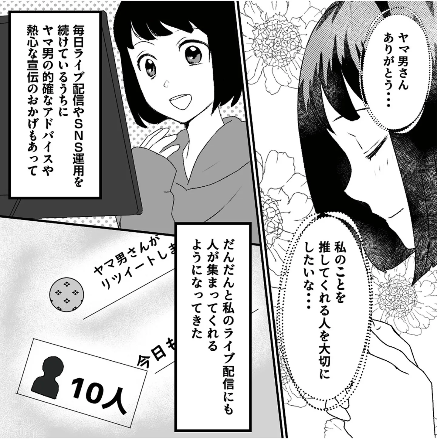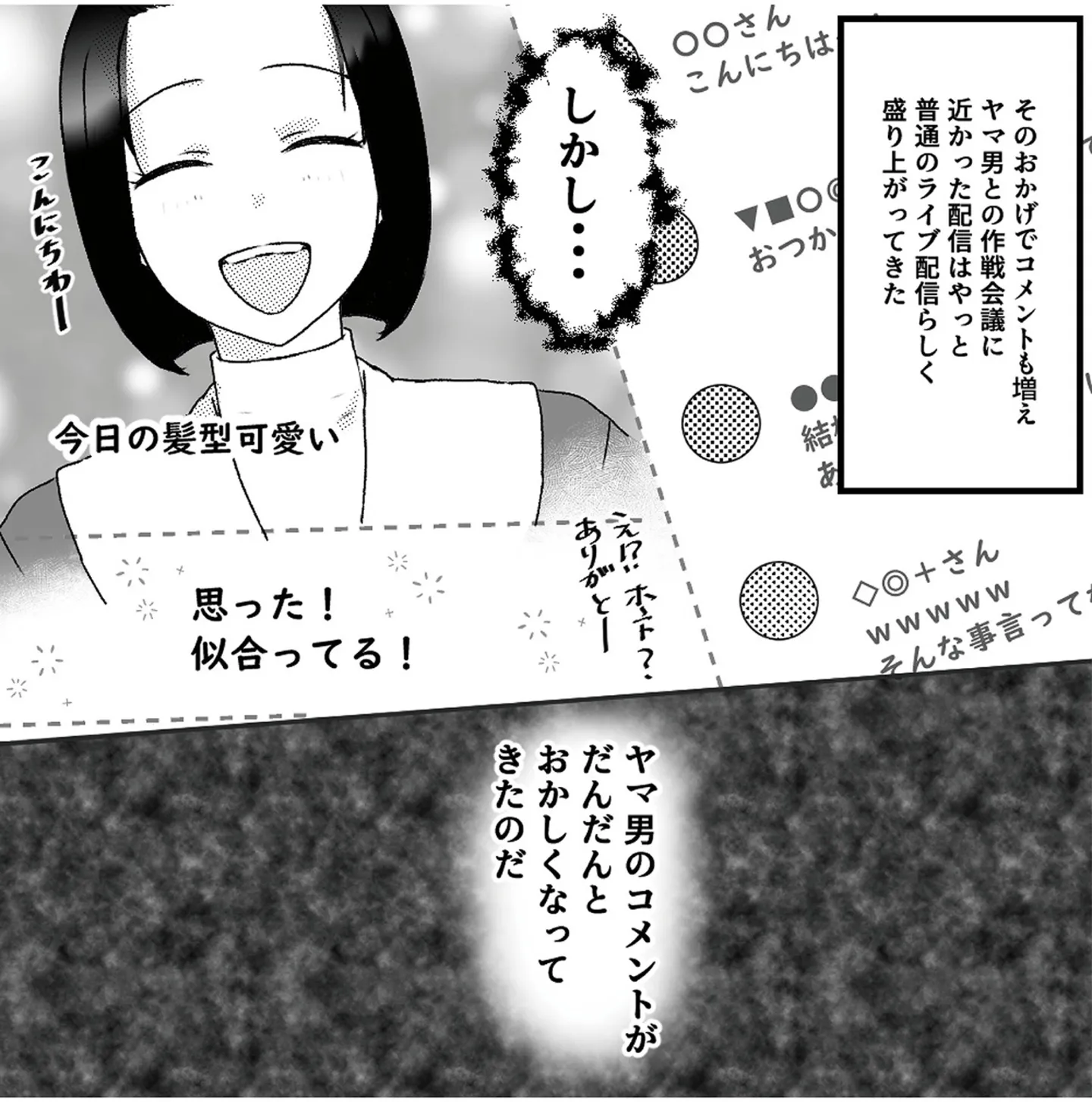 ライブ配信を始めるも人が集まらない。一人だけ熱心にコメントをくれる男性が/「君の住所知ってるよ」ライブ配信中ヤバいファンに狙われました② マンガ 公開日:2025/7/27 この連載を最初から読む→ <第3回に続く> 本作品をAmazon(電子)で読む > 本作品をRenta!で読む > 本作品をebookjapanで読む > 本作品をBOOK☆WALKERで読む > « 1 2 3 あわせて読みたい 【漫画】『「君の住所知ってるよ」ライブ配信中ヤバいファンに狙われました』を1話目から読む 【漫画】『母の勘を信じて 次男が入院するまでの記録』を読む 「次にくるマンガ大賞」U-NEXT賞受賞作品を「毎日無料」で読もう! 【漫画】『精神科病棟の青春 あるいは高校時代の特別な1年間について』を読む 最新マンガと話題の書籍を無料で試し読み! 前の回 一覧 人気の連載 次の回 「君の住所知ってるよ」ライブ配信中ヤバいファンに狙われました (LScomic) Amazon 楽天(電子) Renta! ebookjapan ブックライブ コミックシーモア DMMブックス U-NEXT