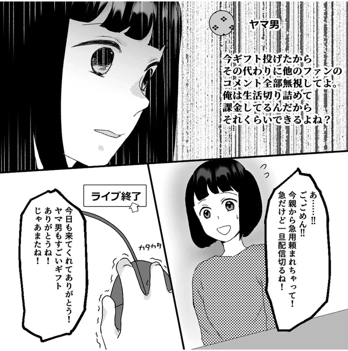 住んでる場所を特定されてる!? 古参リスナーからのDMに身の危険を感じる/「君の住所知ってるよ」ライブ配信中ヤバいファンに狙われました⑤ マンガ 公開日:2025/7/30 この連載を最初から読む→ 本作品をAmazon(電子)で読む > 本作品をRenta!で読む > >> 次のページに続く « 1 2 3 > あわせて読みたい 【漫画】『「君の住所知ってるよ」ライブ配信中ヤバいファンに狙われました』を1話目から読む 【漫画】『策略女を許さない 職場のヤバイ女が自滅するまで』を読む 「次にくるマンガ大賞」U-NEXT賞受賞作品を「毎日無料」で読もう! 【漫画】『うちは「問題」のある家族でした』を読む 最新マンガと話題の書籍を無料で試し読み! 前の回 一覧 人気の連載 次の回 「君の住所知ってるよ」ライブ配信中ヤバいファンに狙われました (LScomic) Amazon 楽天(電子) Renta! ebookjapan ブックライブ コミックシーモア DMMブックス U-NEXT