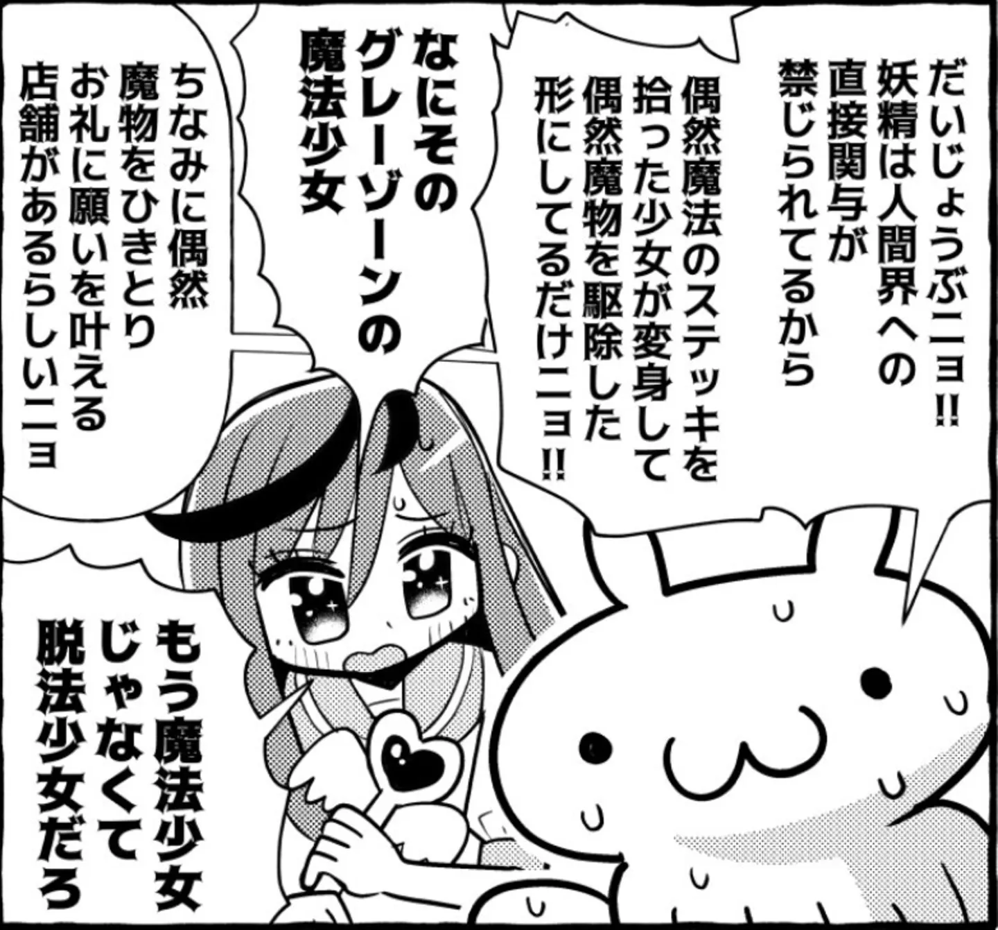ある日、道を歩いていた少女の前に突然現れた謎の妖精は、少女の足元に魔法のステッキをポイっと投げ捨ててこう告げる。「魔物を倒すためステッキを拾い、魔法少女に変身するニョ~!!」。