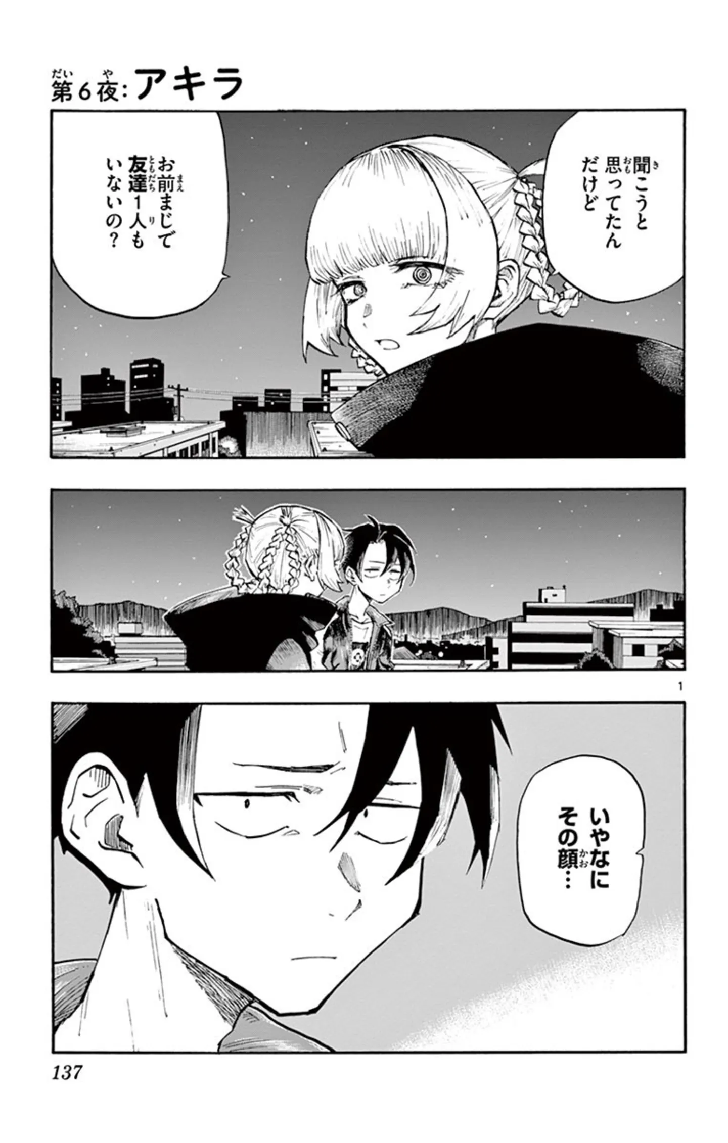 「友達ってなんだろう…」吸血鬼と別れた帰り道に考えていると、突然トランシーバーが鳴り?/よふかしのうた⑦ マンガ 公開日:2025/10/6 この連載を最初から読む→ 『よふかしのうた』(コトヤマ/小学館)第7回【全19回】 恋と青春は、夜に生まれる──。不眠が続く中学2年生・夜守コウは初めてひとりで外に出た夜、美しい吸血鬼・七草ナズナと出会う。「今日に満足できるまで、夜ふかししてみろよ。少年」。ナズナとのふたりきりの夜ふかしがコウの運命を大きく動かしていく。アニメ第2期も放送中の、夜の静寂と青春が交差する異色ラブストーリー『よふかしのうた』をお楽しみください! 【30日間無料】Amazonの読み放題をチェック > 本作品をAmazon(電子)で読む > 本作品をRenta!で読む > >> 次のページに続く 1 2 3 4 > あわせて読みたい 【本書のレビュー記事を見る】夜の街を彷徨う不眠少年と、そこで出会った美少女吸血鬼。ふたりの恋の行方は? あなたの夜更かしがさらに捗るボーイミーツガール『よふかしのうた』【書評】 【漫画】『よふかしのうた』を第1回から読む 【漫画】『まちの本屋の御書山さん』を読む 最新マンガと話題の書籍を無料で試し読み! 前の回 一覧 人気の連載 次の回 よふかしのうた(1) (少年サンデーコミックス) Amazon(電子) Amazon 楽天(電子) Renta! ebookjapan ブックライブ コミックシーモア DMMブックス U-NEXT よふかしのうた(20) (少年サンデーコミックス) Amazon(電子) Amazon 楽天(電子) Renta! ebookjapan ブックライブ コミックシーモア DMMブックス U-NEXT