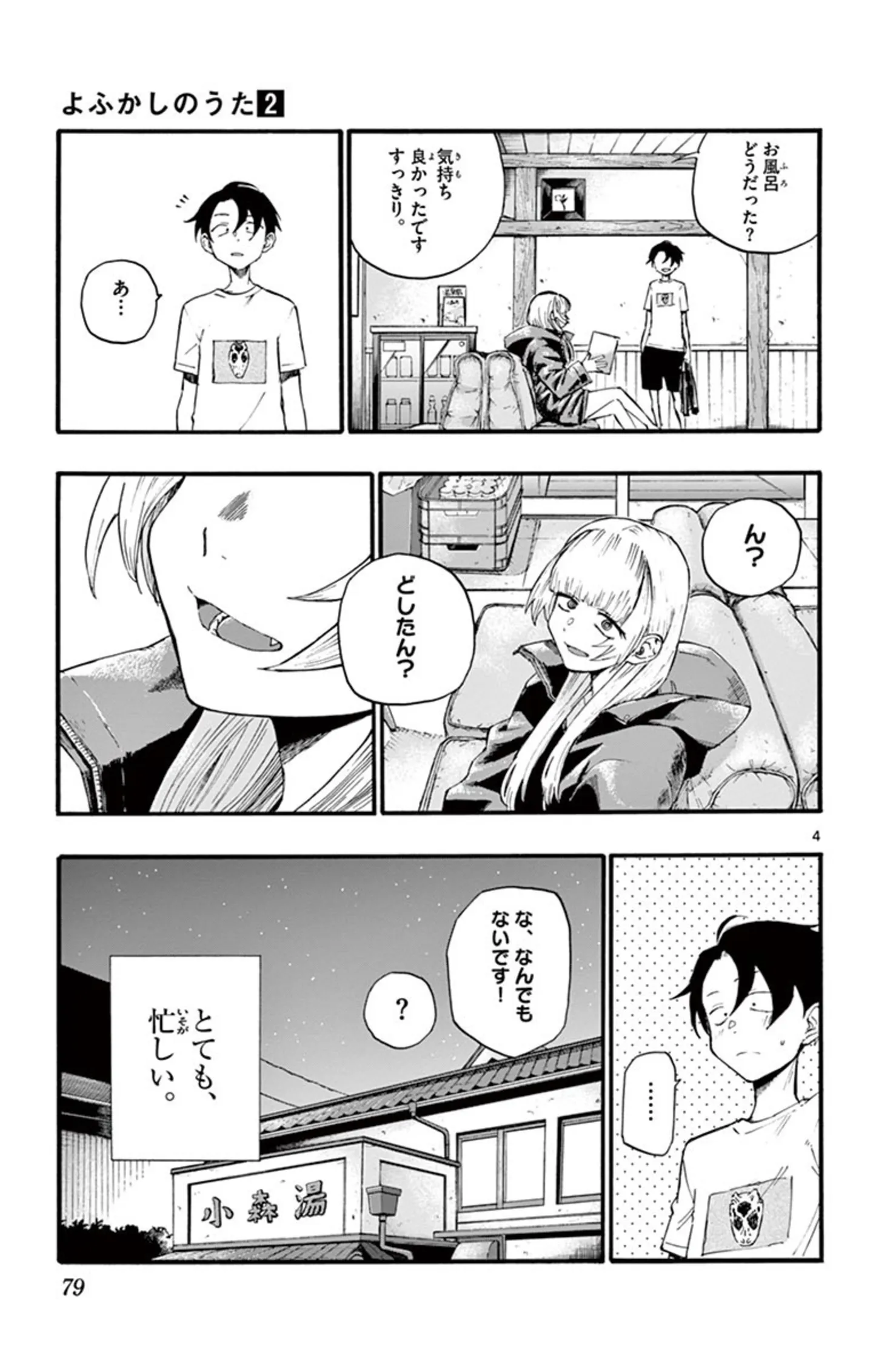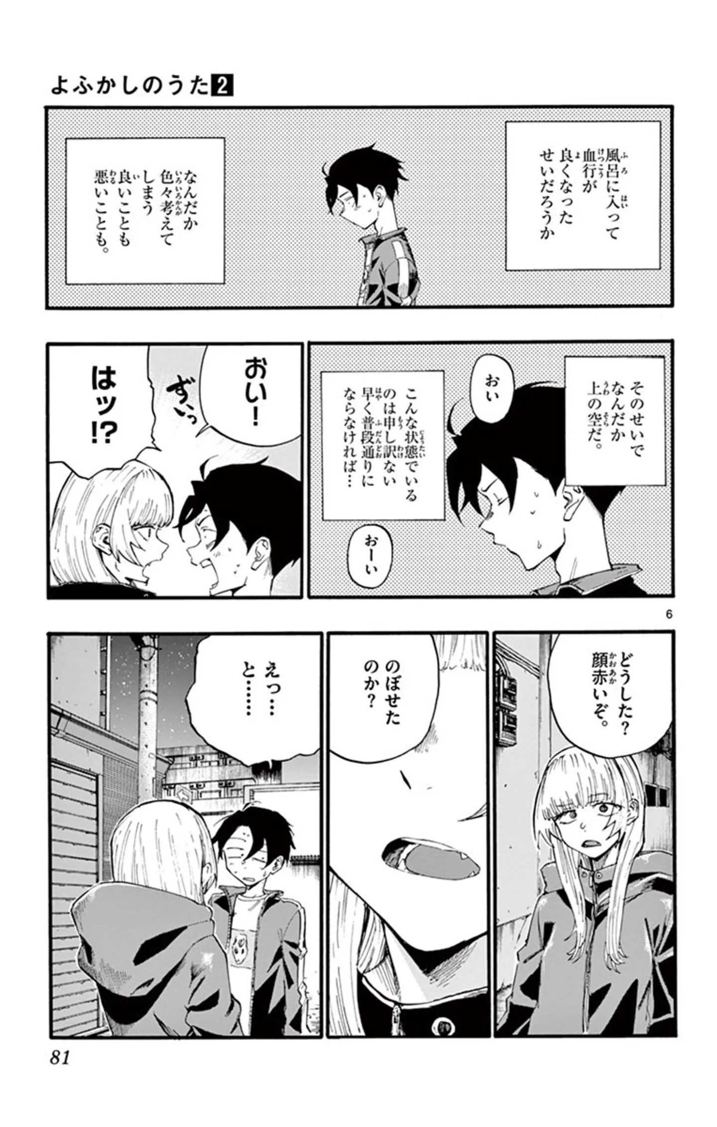 風呂に入ってのぼせた!? 風呂上がりでいつもと違う髪型というだけでドキドキしてしまう/よふかしのうた⑭ マンガ 公開日:2025/10/13 この連載を最初から読む→ 本作品をAmazon(電子)で読む > 本作品をRenta!で読む > >> 次のページに続く « 1 2 3 4 > あわせて読みたい 【本書のレビュー記事を見る】夜の街を彷徨う不眠少年と、そこで出会った美少女吸血鬼。ふたりの恋の行方は? あなたの夜更かしがさらに捗るボーイミーツガール『よふかしのうた』【書評】 【漫画】『よふかしのうた』を第1回から読む 【漫画】『女はいつまで女ですか?』を読む 最新マンガと話題の書籍を無料で試し読み! 前の回 一覧 人気の連載 次の回 よふかしのうた(1) (少年サンデーコミックス) Amazon(電子) Amazon 楽天(電子) Renta! ebookjapan ブックライブ コミックシーモア DMMブックス U-NEXT よふかしのうた(20) (少年サンデーコミックス) Amazon(電子) Amazon 楽天(電子) Renta! ebookjapan ブックライブ コミックシーモア DMMブックス U-NEXT