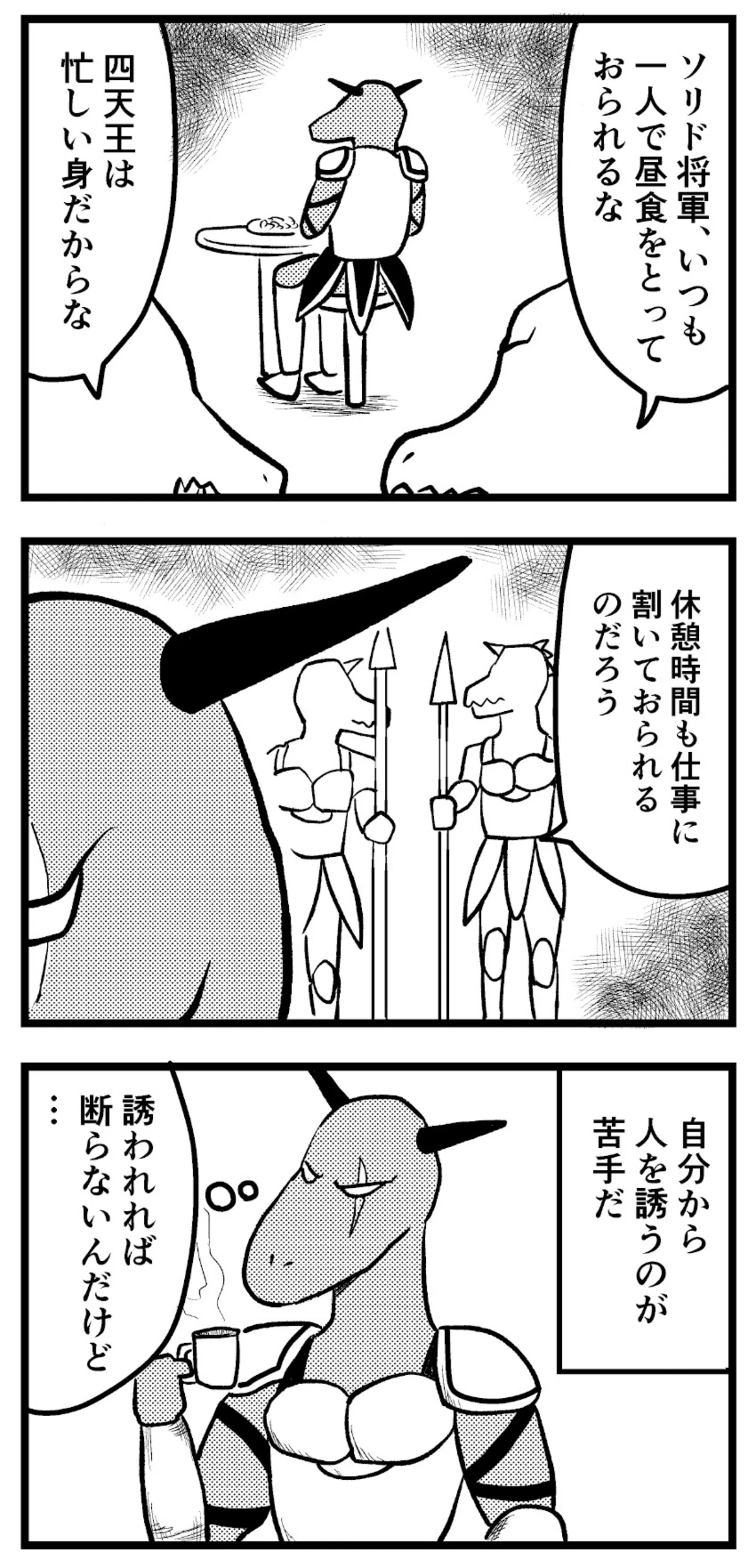魔王軍四天王のひとりにして孤高の将軍。彼がいつもひとりで食事をする理由とは?/魔王軍はホワイト企業1⑯ マンガ 公開日:2025/9/28 この連載を最初から読む→ 気高きドラゴン、ソリド将軍 気にしいな性格、ソリド将軍 孤独でいたいわけじゃない <第17回に続く> 本作品をAmazonで読む > 本作品をRenta!で読む > 本作品をebookjapanで読む > 本作品をBOOK☆WALKERで読む > « 1 2 あわせて読みたい 【漫画】『魔王軍はホワイト企業』を第1回から読む 「お前ら何年戦うんだよ!!」勤続300年の聖剣が激務に耐えかねて、向かった先は… 働き方がホワイトすぎる“魔王軍”!? 【漫画】『今日もネコ様の圧が強い』を読む 【漫画】『コウノトリのお手伝い』を読む 最新マンガと話題の書籍を無料で試し読み! 前の回 一覧 人気の連載 次の回 魔王軍はホワイト企業 Amazon(電子) Amazon 楽天(電子) Renta! ebookjapan ブックライブ コミックシーモア DMMブックス U-NEXT 魔王軍はホワイト企業 2 Amazon(電子) Amazon 楽天(電子) 魔王軍はホワイト企業 3 Amazon(電子) Amazon 楽天(電子)