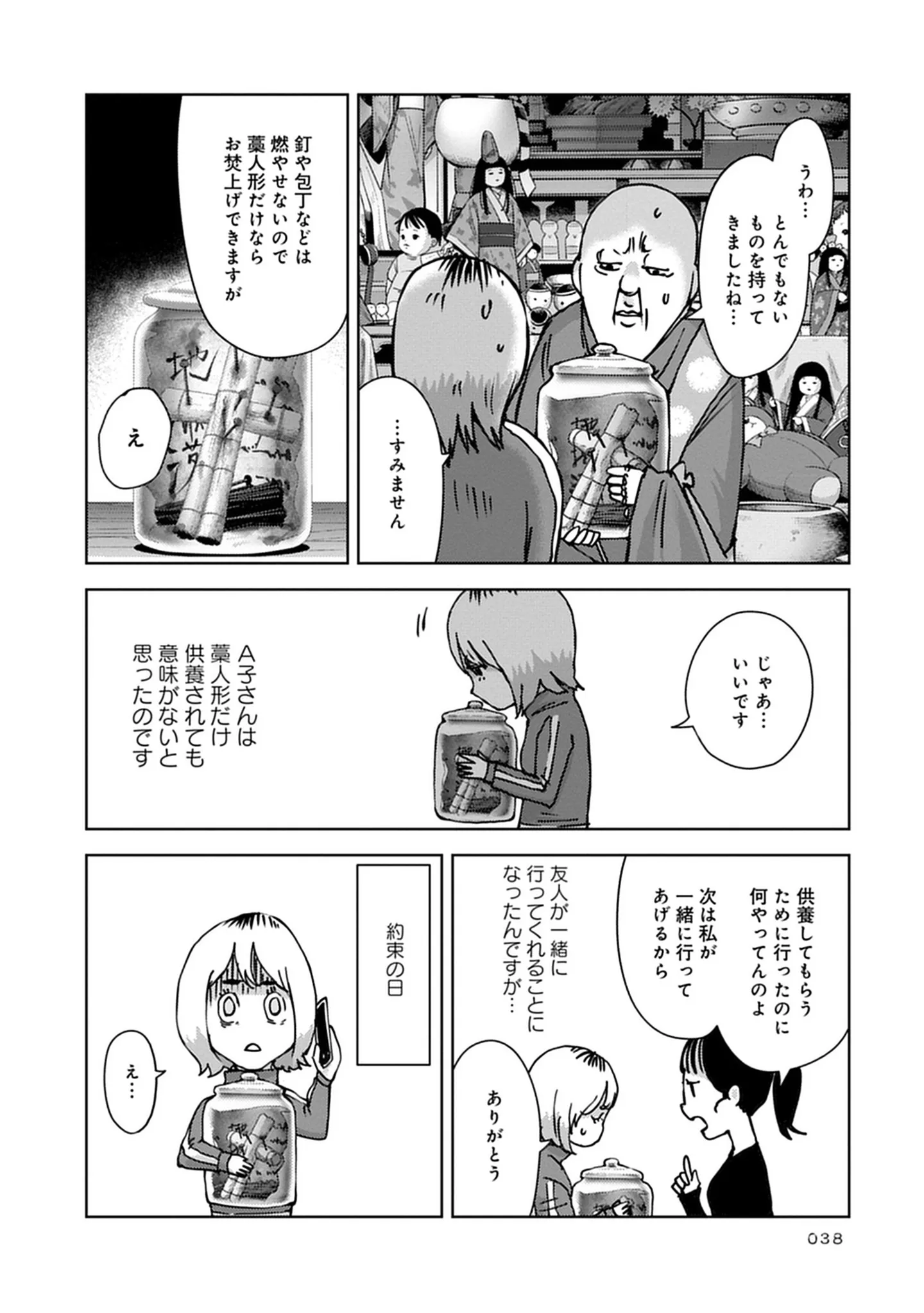 元カレを恨んで作った藁人形が愛おしい。新しい恋をきっかけに供養してもらうはずが…/ぼくと呪物の奇妙な生活3⑯ マンガ 公開日:2025/10/5 この連載を最初から読む→ <第17回に続く> 本作品をAmazon(電子)で読む > 本作品をRenta!で読む > 本作品をebookjapanで読む > 本作品をBOOK☆WALKERで読む > « 1 2 あわせて読みたい 【漫画】『ぼくと呪物の奇妙な生活(1~3巻)』を第1回から読む 【漫画】『今日もネコ様の圧が強い』を読む 【漫画】『見える子ちゃん』を読む 人気のホラー作品を無料で試し読み! 前の回 一覧 人気の連載 次の回 ぼくと呪物の奇妙な生活 呪物コレクター誕生秘話編 (バンブーコミックス エッセイセレクション) Amazon(電子) Amazon 楽天(電子) Renta! ebookjapan ブックライブ コミックシーモア DMMブックス U-NEXT ぼくと呪物の奇妙な生活 最恐呪物蒐集編 (バンブーコミックス エッセイセレクション) Amazon(電子) Amazon 楽天(電子) ぼくと呪物の奇妙な生活 闇の契約編 (バンブーコミックス エッセイセレクション) Amazon(電子) Amazon 楽天(電子)