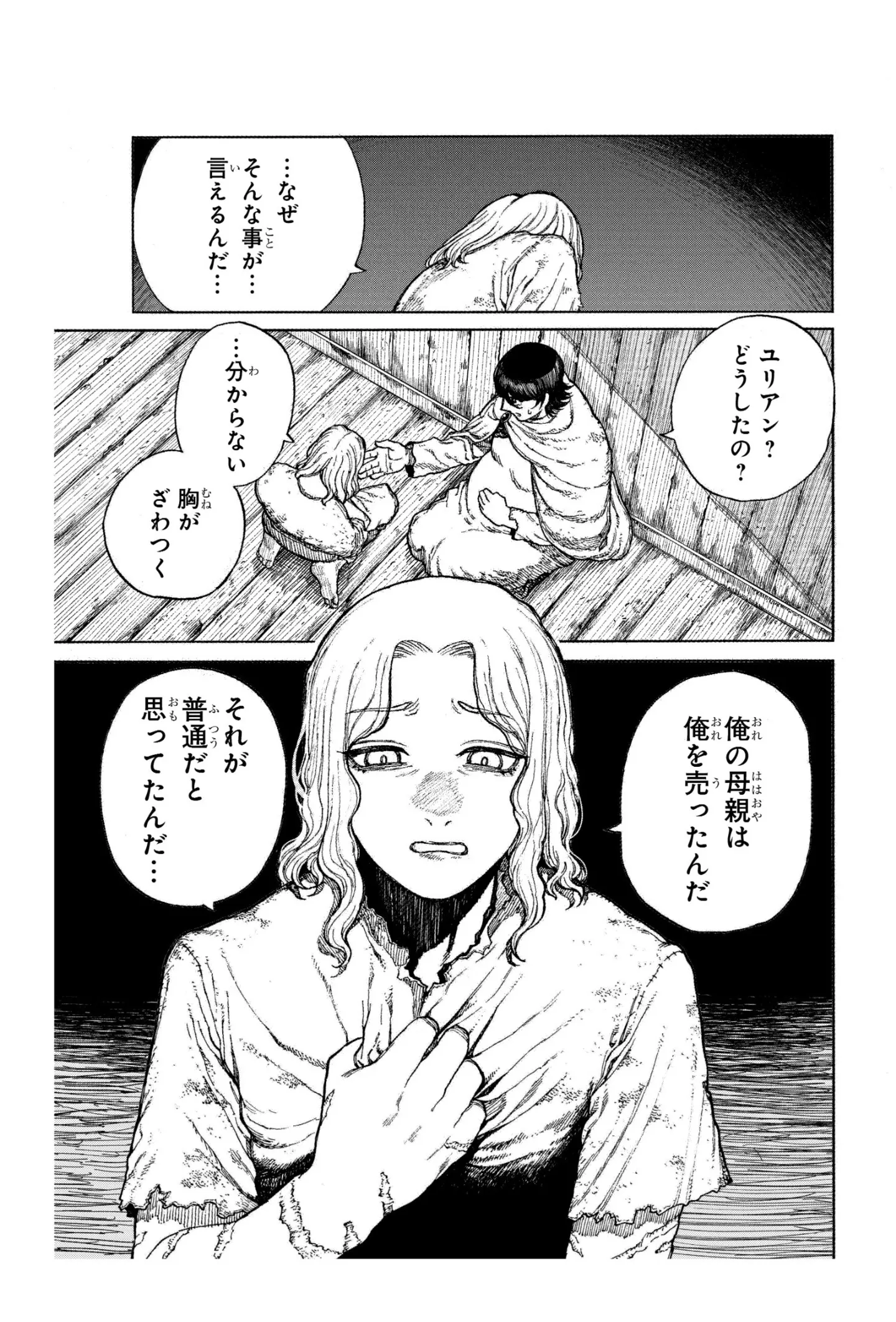 身重の女性が教えてくれた、母親に売られ奴隷になった少年には分からなかった人とのつながり/ケントゥリア② マンガ 公開日:2025/10/4 この連載を最初から読む→ 『ケントゥリア』(暗森透/集英社)第2回【全5回】 「次にくるマンガ大賞 2025」Webマンガ部門第2位! 自由を求め、奴隷船に潜り込んだ少年・ユリアン。100人の奴隷たちのなかで、特に身重のミラはとりわけ彼のことを気にかけ優しく接してくれた。しかし、船が呪われた海域へと入ったとき、恐るべき惨劇が幕を開ける──。自由を求める旅路の先に待つ運命とは? 新時代ダークファンタジー『ケントゥリア』をお楽しみください! 【30日間無料】Amazonの読み放題をチェック > ©暗森透/集英社 本作品をAmazon(電子)で読む > 本作品をRenta!で読む > >> 次のページに続く 1 2 3 4 > あわせて読みたい 【漫画】『ケントゥリア』を第1回から読む 【漫画】『痔だと思ったら大腸がんステージ4でした 標準治療を旅と漫画で乗り越えてなんとか経過観察になるまで』を読む 【漫画】『愛され女子でスミマセン』を読む 最新マンガと話題の書籍を無料で試し読み! 前の回 一覧 人気の連載 次の回 ケントゥリア 1 (ジャンプコミックスDIGITAL) Amazon(電子) Amazon 楽天(電子) Renta! ebookjapan ブックライブ コミックシーモア DMMブックス U-NEXT ケントゥリア 6 (ジャンプコミックスDIGITAL) Amazon(電子) Amazon 楽天(電子)
