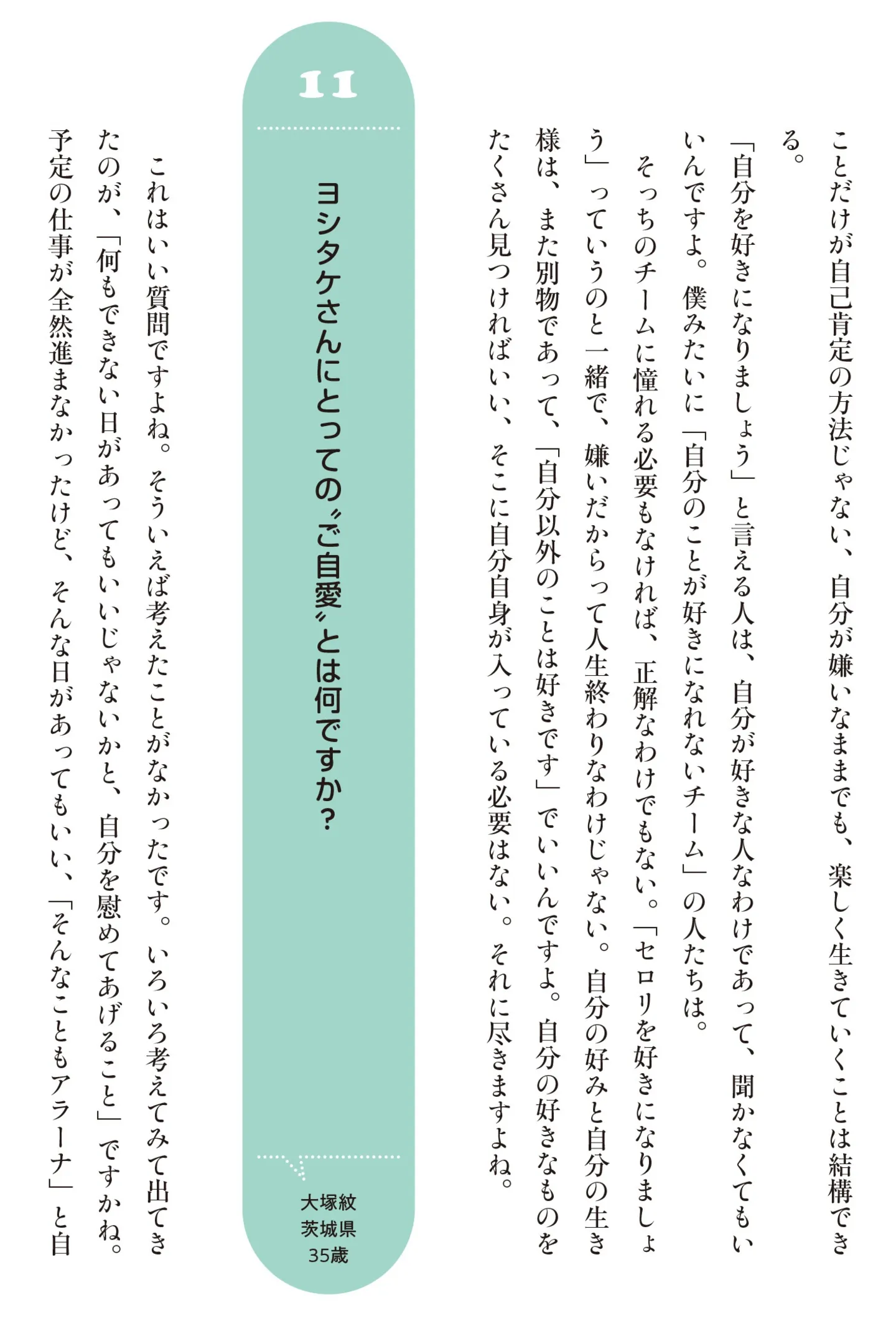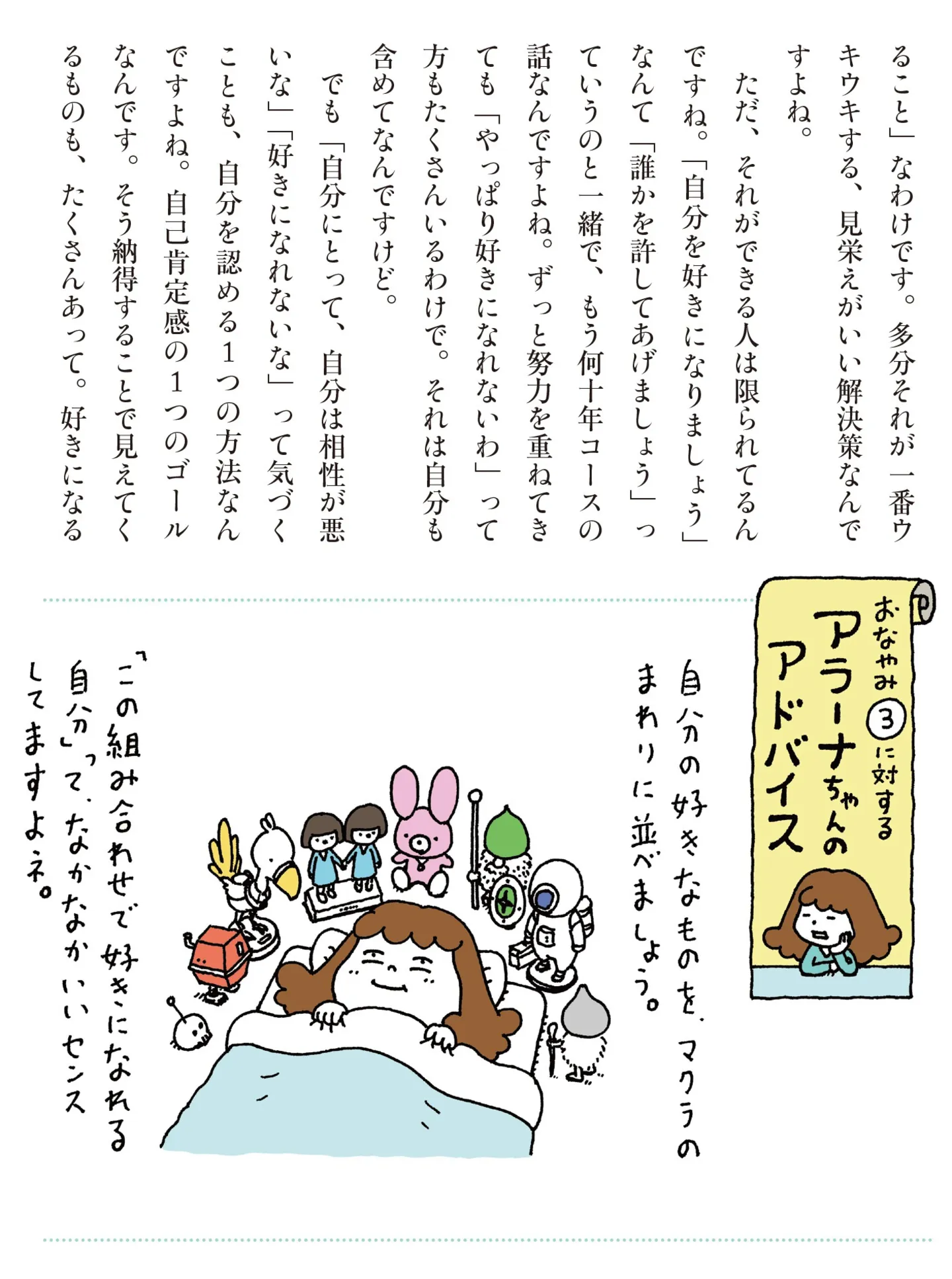 「自分を好きになりましょう」よく言われるけれど、自分を好きになれない人は?/ヨシタケシンスケ お悩み相談 そんなこともアラーナ⑥ 暮らし 公開日:2025/10/8 この連載を最初から読む→ 本作品をAmazonで読む > <第7回に続く> « 1 2 あわせて読みたい 【本作のレビューを読む】ヨシタケシンスケ お悩み相談に「ネガティブさが足りない(笑)」? “元気のない歴50年”の著者とともに心を軽くする「そんなこともアラーナ」 『お悩み相談 そんなこともアラーナ』を第1回から読む 【漫画】『10代の時のつらい経験、私たちはこう乗り越えました』を読む 最新マンガと話題の書籍を無料で試し読み! 前の回 一覧 人気の連載 次の回 お悩み相談 そんなこともアラーナ Amazon