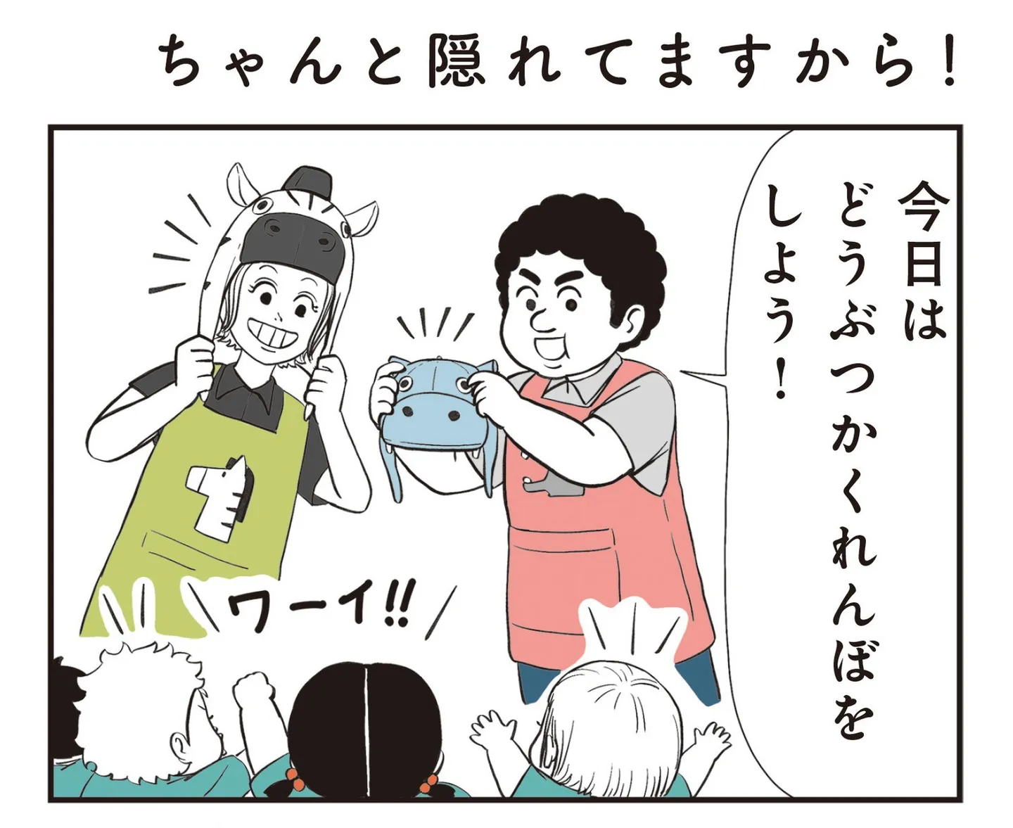 動物の被り物をつけてかくれんぼ。カメレオンは擬態化するから見つからない?/着ぐるみ家族2④ マンガ 公開日:2025/10/6 この連載を最初から読む→ 『着ぐるみ家族2』(Masaki/KADOKAWA)第4回【全32回】 いつも無表情だけど心の中ではノリノリ! 家族が大好きなパパと、家族の重要なツッコミ役でいつも誰よりも楽しんでいるママ、そしてごっこ遊びが大好きなおてんば少女のムスメちゃん。ちょっとおかしな3人家族が着ぐるみで繰り広げる非日常的な日々。シュールなイラストとほっこりする家族ネタに、読んでいるうちについ笑みがこぼれてしまうこと間違いなし。着ぐるみ大好きな家族の笑いが絶えない日常が詰め込まれた『着ぐるみ家族2』をお楽しみください! 【30日間無料】Amazonの読み放題をチェック > 本作品をAmazon(電子)で読む > 本作品をRenta!で読む > >> 次のページに続く 1 2 > あわせて読みたい 【漫画】『着ぐるみ家族2』を第1回から読む 【漫画】『娘を妊娠させたのは誰ですか?』を読む 【漫画】『実家に帰りたくありません』を読む 最新マンガと話題の書籍を無料で試し読み! 前の回 一覧 人気の連載 次の回 着ぐるみ家族2 (コミックエッセイ) Amazon(電子) Amazon 楽天(電子) Renta! ebookjapan ブックライブ コミックシーモア DMMブックス U-NEXT 着ぐるみ家族 (コミックエッセイ) Amazon(電子) Amazon 楽天(電子)