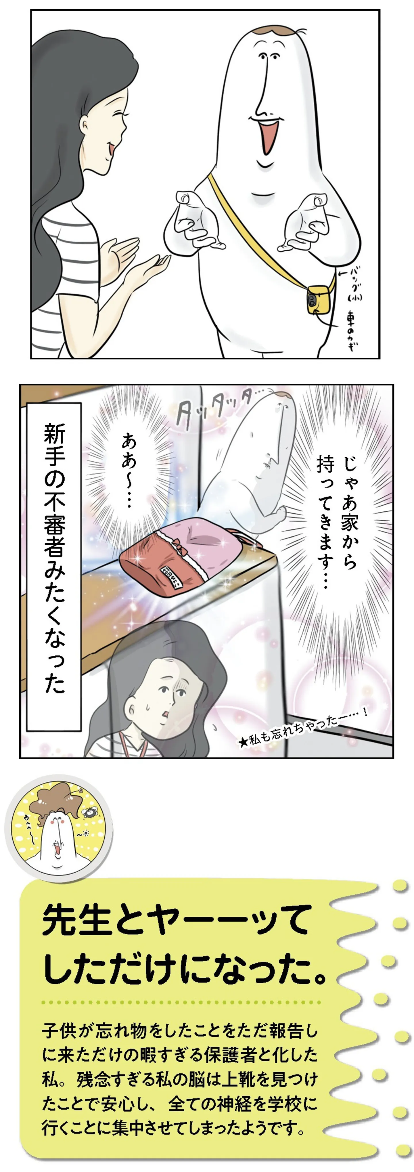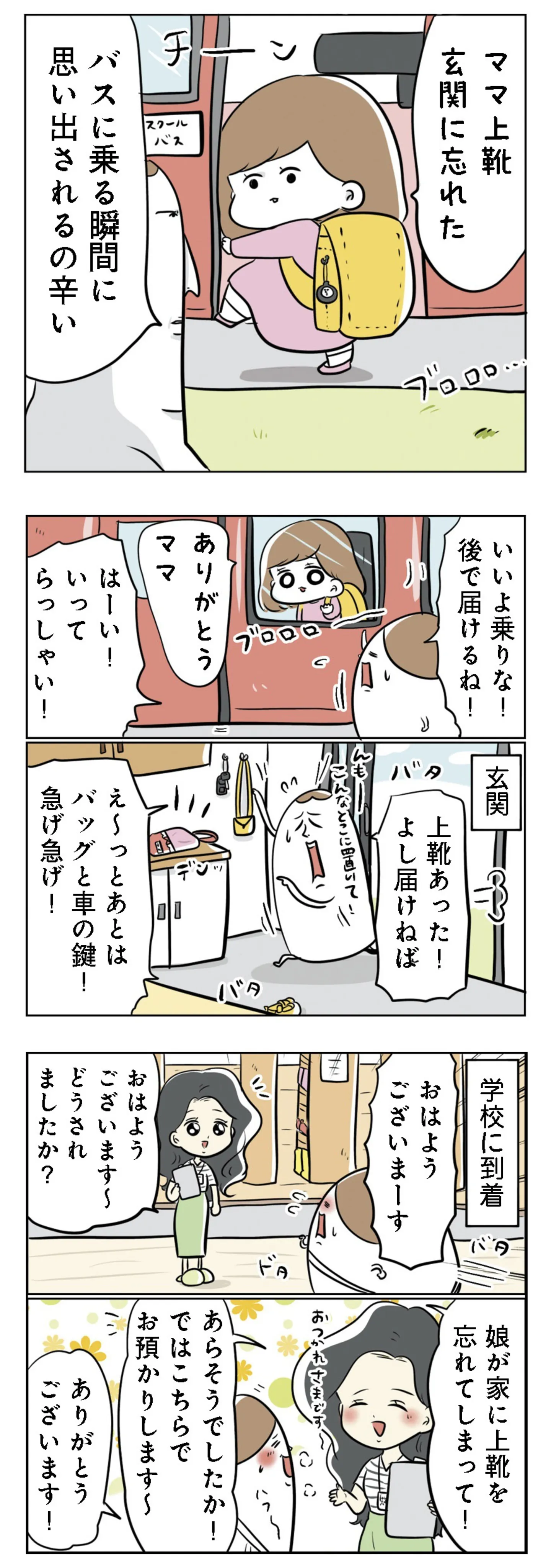 母、まさかのやらかし! 長女が忘れた上靴を学校へ届けに行ったはずが…/まむの巣! マンガ 公開日:2025/10/19 この連載を最初から読む→ 忘れ物物語(前編) 本作品をAmazon(電子)で読む > 本作品をRenta!で読む > >> 次のページに続く « 1 2 3 4 > あわせて読みたい 【漫画】『まむの巣! ポンコツすぎる子育て日記』を第1回から読む 「ドンマイドンマイ切り替えていくよーー!!」子どもを怒ってしまったと反省するママの脳内に現れたのは…!? ポンコツエピソードも満載のハイテンション育児マンガ 【漫画】『魔王軍はホワイト企業』を第1回から読む 【漫画】『勤労ロードショー 今日も財布がさみしくて』を読む 【漫画】『夫ですが会社辞めました』を読む 【漫画】『実家に帰りたくありません』を読む 【漫画】『プリンセスお母さん』を読む 最新マンガと話題の書籍を無料で試し読み! 前の回 一覧 人気の連載 次の回 まむの巣!ポンコツすぎる子育て日記 Amazon(電子) Amazon 楽天(電子) Renta! ebookjapan ブックライブ コミックシーモア DMMブックス U-NEXT