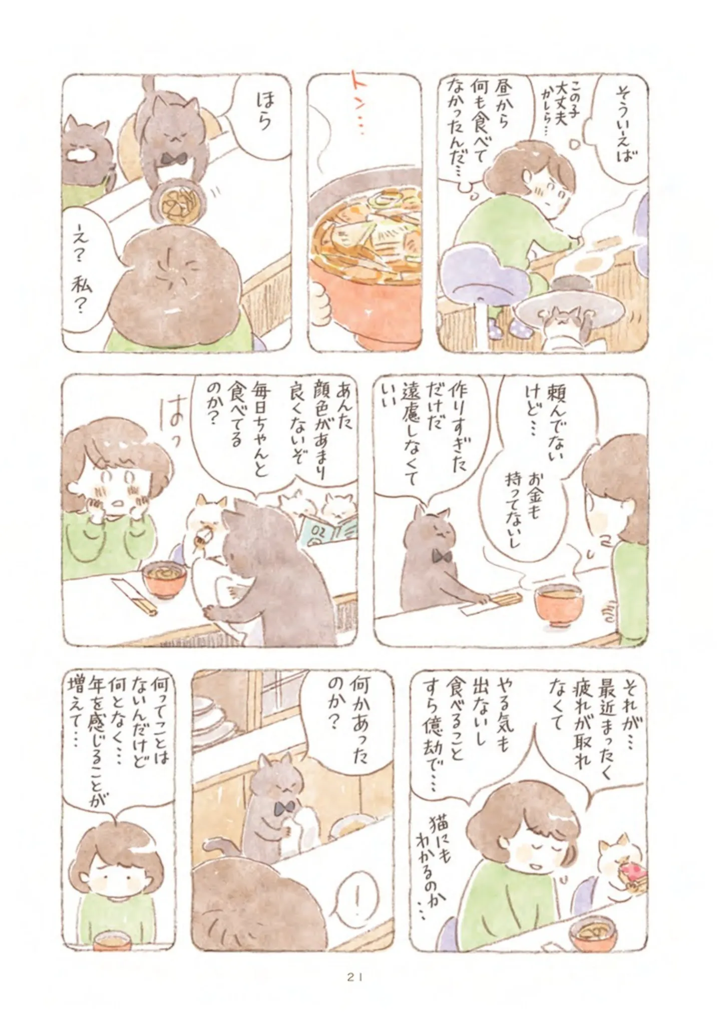 黒猫マスターの味噌汁に癒やされる…疲れた40代女性が猫の集まる喫茶店に来店/深夜3時のくろねこ喫茶② マンガ 公開日:2025/10/18 この連載を最初から読む→ 本作品をAmazon(電子)で読む > >> 次のページに続く « 1 2 3 > あわせて読みたい ねこまき最新刊! 真夜中だけ開くねこ喫茶店。擬人化したねことグルメが悩める人間を救うハートフル漫画 【漫画】『深夜3時のくろねこ喫茶』を第1回から読む 【漫画】『すべての恋が終わるとしても』を第1回から読む 【漫画】『黒猫ろんと暮らしたら』を読む 【漫画】『痔だと思ったら大腸がんステージ4でした 標準治療を旅と漫画で乗り越えてなんとか経過観察になるまで』を読む 最新マンガと話題の書籍を無料で試し読み! 前の回 一覧 人気の連載 次の回 深夜3時のくろねこ喫茶 (OZcomics) Amazon