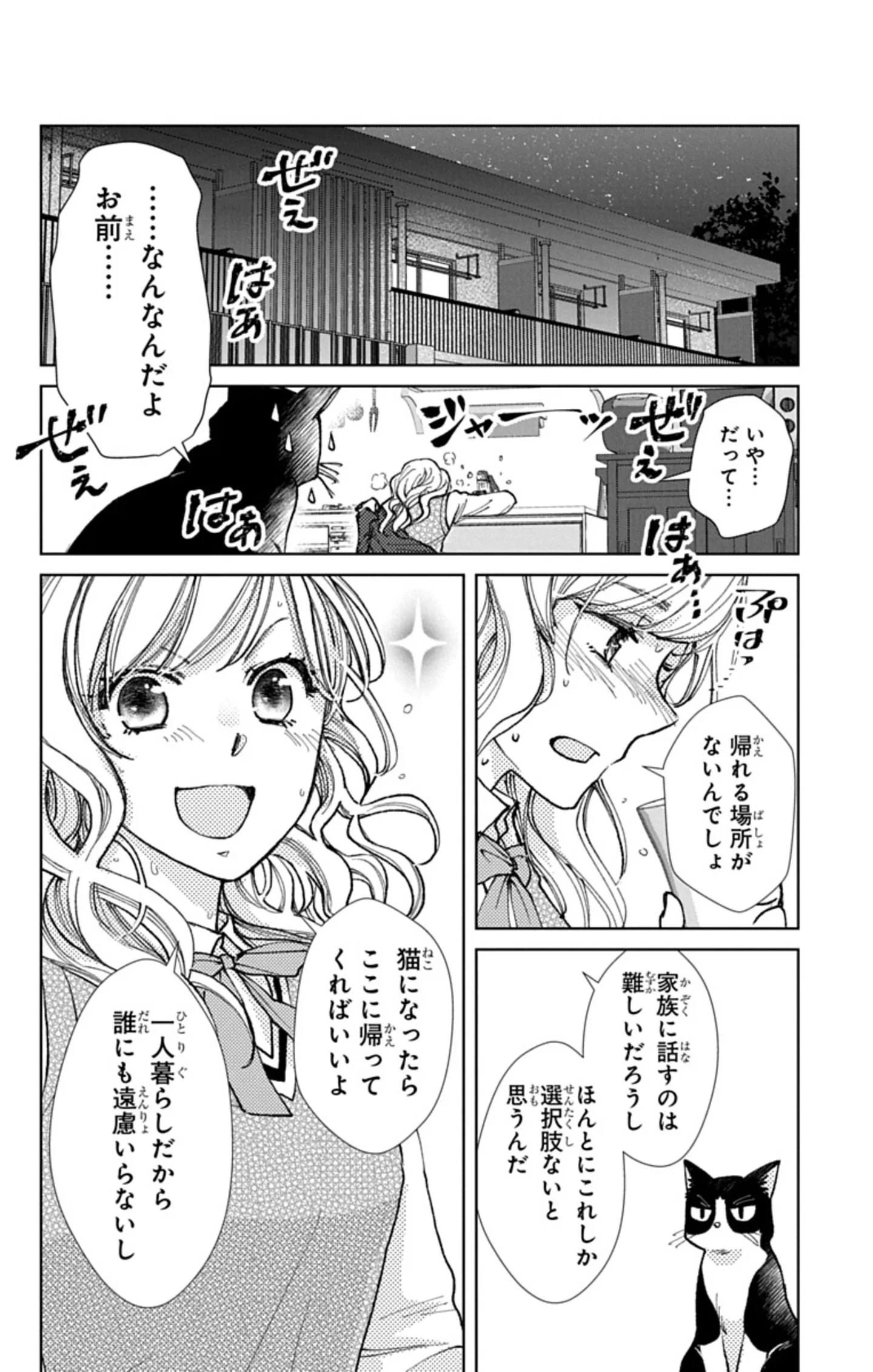 「私が守れる範囲の命はぜんぶ面倒見る」と橘くんに啖呵を切る凛。そのかなりの面倒見の良さの理由は、凛が早くに母を亡くし、父も去年亡くなったからだということが読み進めるとわかってくる。命の儚さを痛感する凛だからこそ、猫アレルギーでも野良猫の世話を欠かさないし、猫になり行き場をなくした橘くんを放っておけないのだ。