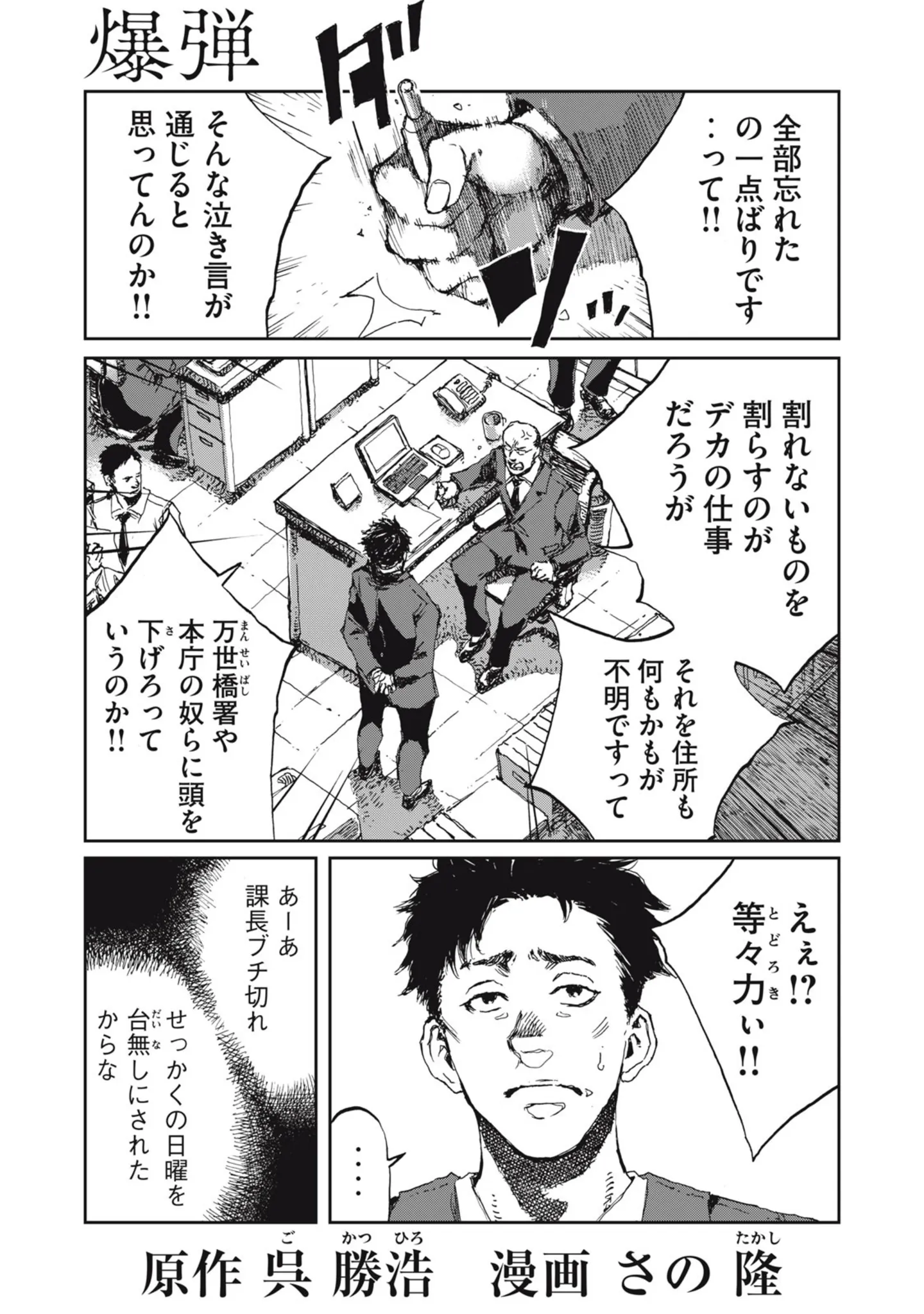 中年男が予言した第二の爆発まで残り45分…彼は取り調べに引き続き同じ刑事を指名してきたが?/爆弾③ マンガ 公開日:2025/11/2 この連載を最初から読む→ 『爆弾』(呉勝浩、さの隆/講談社)第3回【全8回】 ささいな傷害事件で警察に連行された中年男。スズキタゴサクと名乗るその男は「10時に秋葉原で爆発がある」と予言すると、直後に秋葉原の廃ビルが爆発。さらに男は「ここから三度、次は1時間後に爆発します」と続け――。呉勝浩氏による原作小説は『このミステリーがすごい!』(宝島社)、『ミステリが読みたい!』(早川書房)の2大ランキングで1位を獲得。2025年10月31日には山田裕貴、伊藤沙莉、染谷将太、渡部篤郎、佐藤二朗ら豪華キャストによる映画が公開。爆弾魔の悪意に戦慄するノンストップミステリー『爆弾』のコミカライズをお届けします。 【30日間無料】Amazonの読み放題をチェック > 本作品をAmazon(電子)で読む > 本作品をBOOK☆WALKERで読む > >> 次のページに続く 1 2 3 > あわせて読みたい 【前話を読む】「10時ピッタリ、秋葉原のほうで何かありますよ」霊感が強いという中年男の言葉を聞き流していると…/爆弾 【第1回から読む】ささいな傷害事件で連行された中年男。時間のムダと思われた取り調べが…/爆弾 「異議あり」突如、法廷を占拠した男の要求は「死刑囚の死刑執行」と「現場の生中継」! ミステリランキングを席巻した『爆弾』続編は エンタメ性200%増 爆弾魔が人間の本性に火をつける! 内に秘めた悪意を炙り出すノンストップ・ミステリー『爆弾』 執筆の原動力は、「怒り」。ムカつきが創作意欲を駆り立てる──小説家・呉勝浩インタビュー 最新マンガと話題の書籍を無料で試し読み! 前の回 一覧 人気の連載 次の回 爆弾(1) (コミックDAYSコミックス) Amazon(電子) Amazon 楽天(電子)