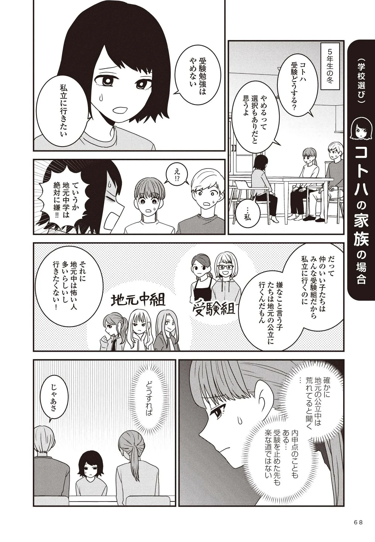 「生きづらいと思ったら親子で発達障害でした」の著者モンズースー氏。子どもが過ごす居場所の選択肢は多いほど良いと考えた彼女が、発達に偏りのある子の進路に悩んでいる家庭や情報を探している方の力になればと、選択肢の一つとして受験を経験した4つの家庭に取材し、実録コミック『発達障害っ子の中学受験』にまとめました。「受験を決意した理由」「塾や学校選び」「勉強の工夫」「病院や薬との付き合い方」「合否を迎える瞬間」「入学後に感じたこと」――各テーマを通して、壁にぶつかりながらも家族が大切にした思いや選択が浮かび上がります。