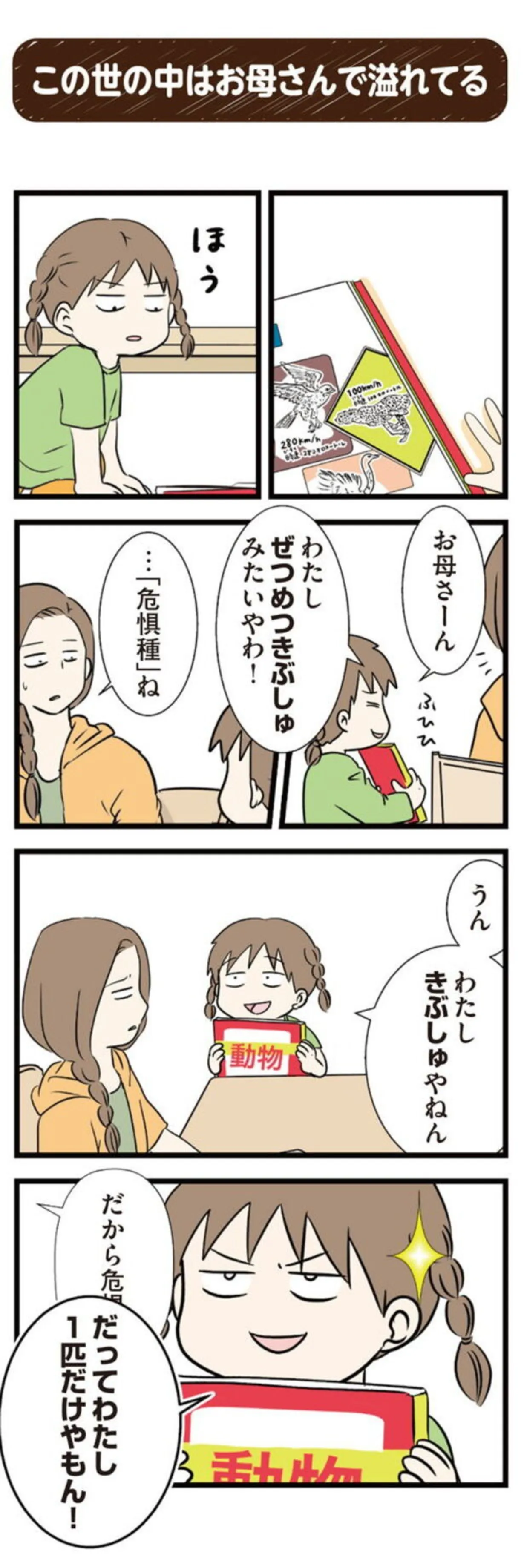 お母さんはたくさんいる?「絶滅危惧種」を勉強した末娘のかわいい勘違い/小学生エムモトえむみの勝手きままライフ マンガ 公開日:2025/11/21 この連載を最初から読む→ <第9回に続く> 本作品をAmazon(電子)で読む > 本作品をRenta!で読む > 本作品をebookjapanで読む > 本作品をBOOK☆WALKERで読む > « 1 2 3 4 あわせて読みたい 【漫画】『小学生エムモトえむみの勝手きままライフ(1~3巻)』を第1回から読む 【漫画】『勤労ロードショー 今日も財布がさみしくて』を読む 【漫画】『なんで私が不倫の子 汚部屋の理由と東大の意味』を読む 【漫画】『お母さんは認知症、お父さんは老人ホーム 介護ど真ん中!親のトリセツ』を読む 【漫画】『望まれて生まれてきたあなたへ』を読む 最新マンガと話題の書籍を無料で試し読み! 前の回 一覧 人気の連載 次の回 小学生エムモトえむみの勝手きままライフ (コミックエッセイ) Amazon(電子) Amazon 楽天(電子) Renta! ebookjapan ブックライブ コミックシーモア DMMブックス U-NEXT いくで!小学生エムモトえむみの勝手きままライフ (コミックエッセイ) Amazon(電子) Amazon 楽天(電子) みてや!小学生エムモトえむみの勝手きままライフ (コミックエッセイ) Amazon(電子) Amazon 楽天(電子)