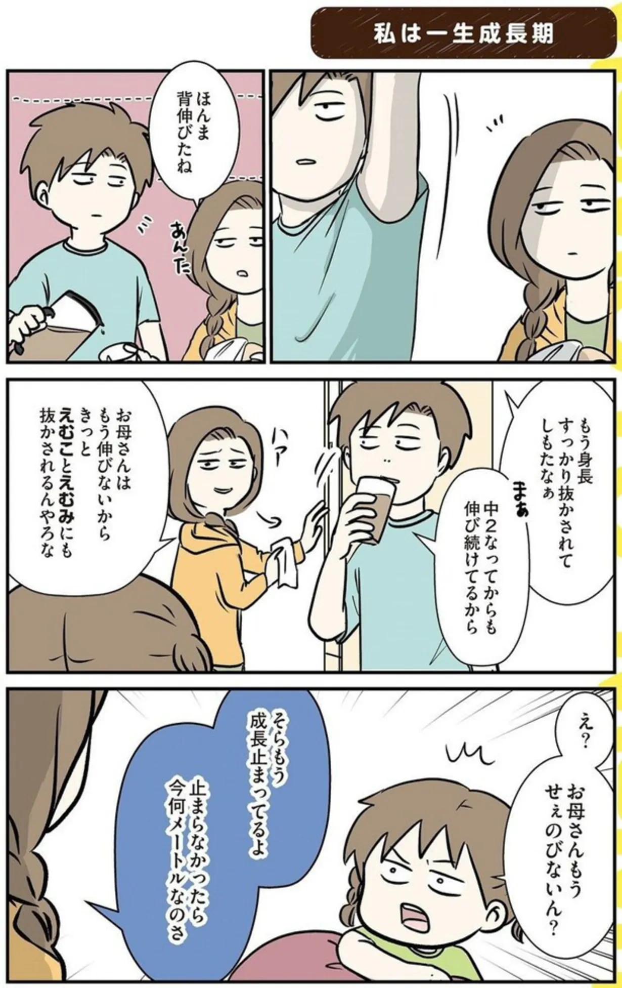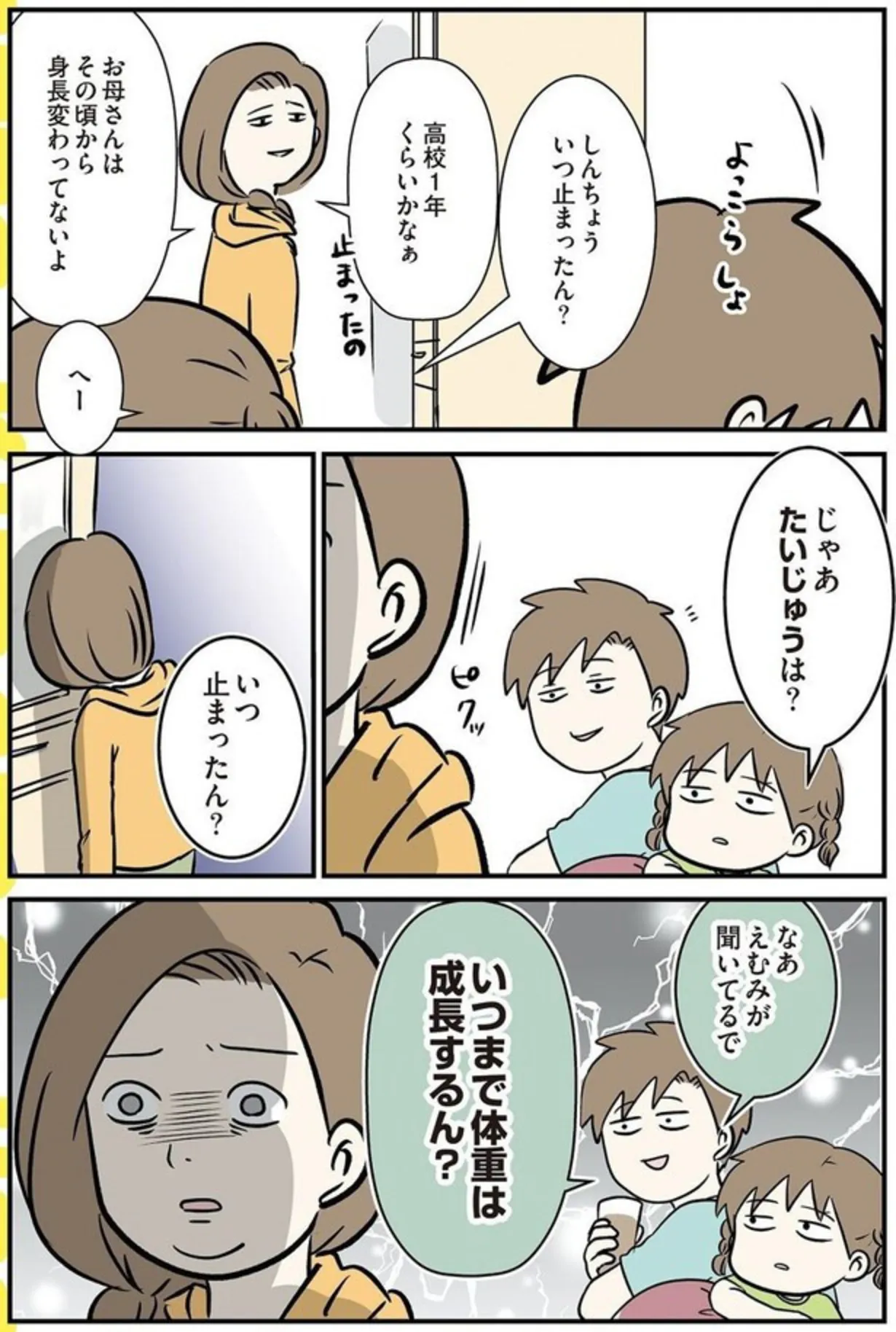 身長が止まったなら体重は…? 末娘の質問に言葉を失う母/いくで!小学生エムモトえむみの勝手きままライフ マンガ 公開日:2025/12/8 この連載を最初から読む→ <第26回に続く> 本作品をAmazon(電子)で読む > 本作品をRenta!で読む > 本作品をebookjapanで読む > 本作品をBOOK☆WALKERで読む > « 1 2 3 4 あわせて読みたい 【漫画】『小学生エムモトえむみの勝手きままライフ(1~3巻)』を第1回から読む 【漫画】『魔王軍はホワイト企業』を読む 【漫画】『令和妊婦、孤高のさけび! 頼りになるのはスマホだけ?!』を読む 【漫画】『理想の父にはなれないけれど』を読む 【漫画】『こんなはずでは系育児』を読む 最新マンガと話題の書籍を無料で試し読み! 前の回 一覧 人気の連載 次の回 小学生エムモトえむみの勝手きままライフ (コミックエッセイ) 試し読み *電子書籍ストアBOOK☆WALKERへ移動します いくで!小学生エムモトえむみの勝手きままライフ (コミックエッセイ) 試し読み *電子書籍ストアBOOK☆WALKERへ移動します みてや!小学生エムモトえむみの勝手きままライフ (コミックエッセイ) 試し読み *電子書籍ストアBOOK☆WALKERへ移動します