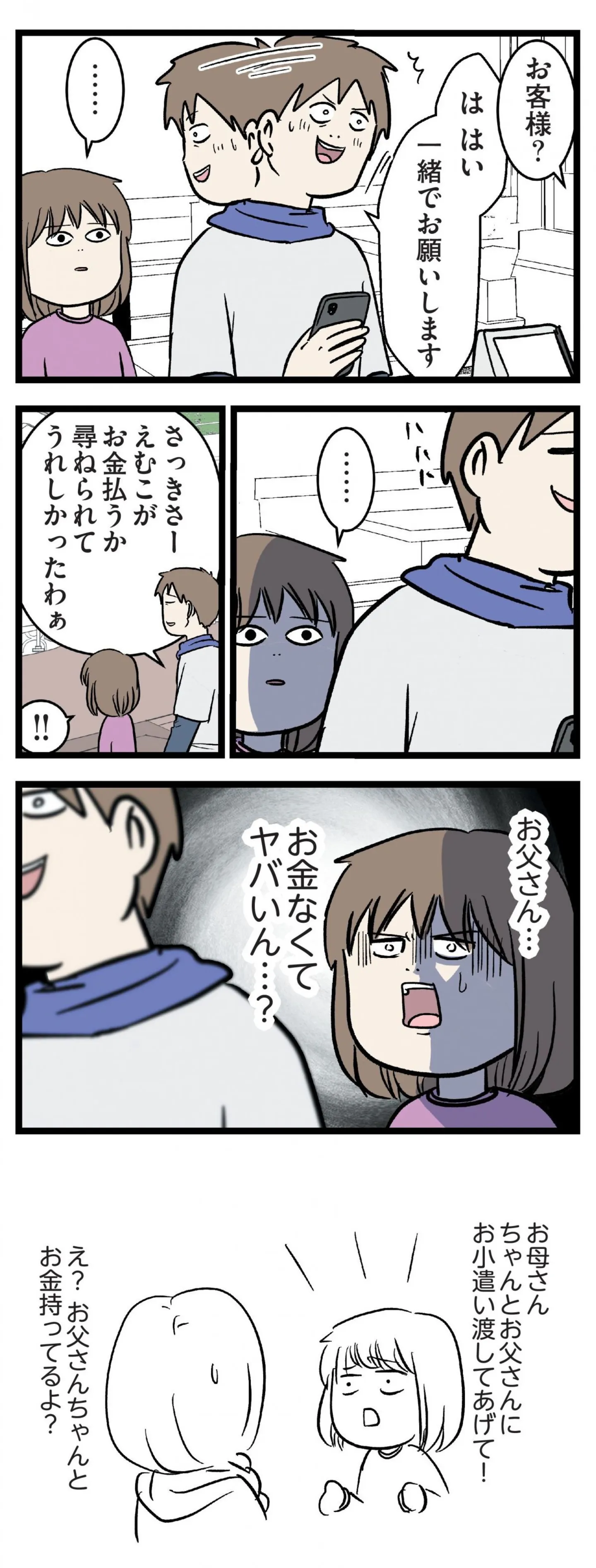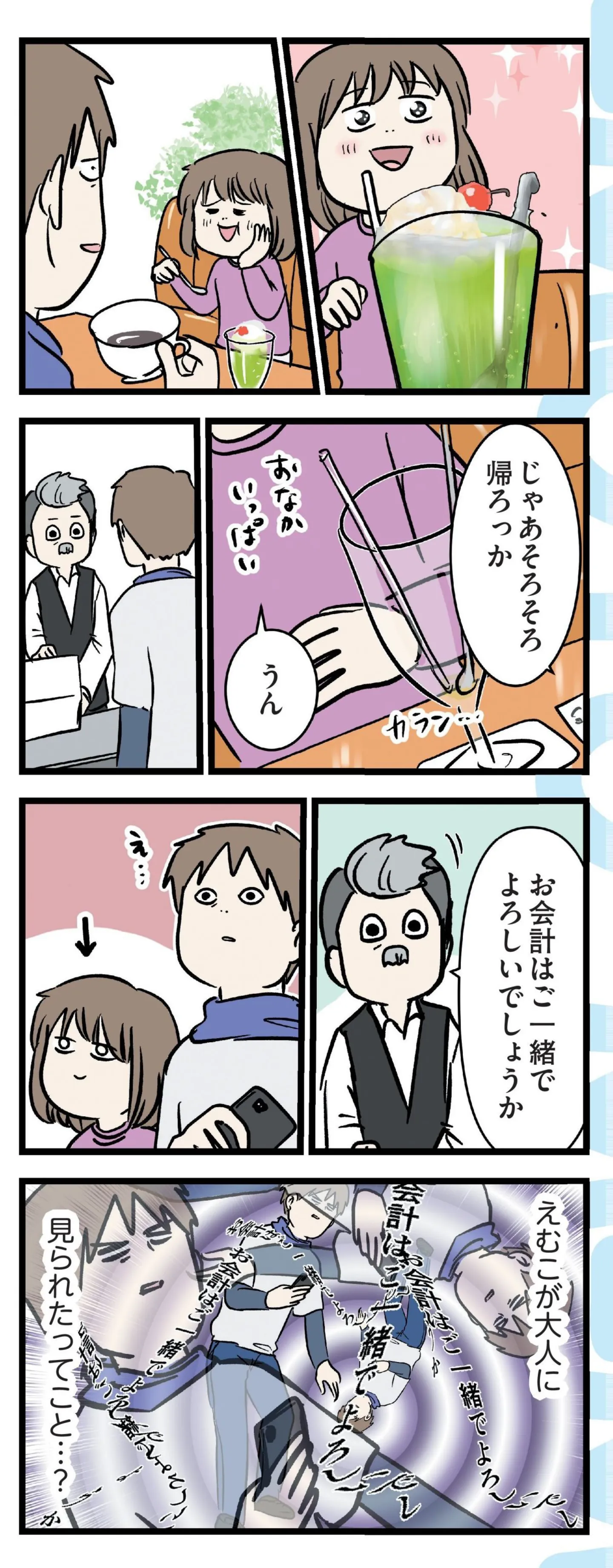お会計はご一緒で? 喫茶店で娘が大人に見られて動揺する父/みてや!小学生エムモトえむみの勝手きままライフ マンガ 公開日:2025/12/21 この連載を最初から読む→ <続きは本書でお楽しみください> 本作品をAmazon(電子)で読む > 本作品をRenta!で読む > 本作品をebookjapanで読む > 本作品をBOOK☆WALKERで読む > « 1 2 あわせて読みたい 【漫画】『小学生エムモトえむみの勝手きままライフ(1~3巻)』を第1回から読む 【漫画】『グランプリは私ですけど何か?~自己肯定モンスターのミスコン無双~』を読む 【漫画】『理想の父にはなれないけれど』を読む 【漫画】『こんなはずでは系育児』を読む 【漫画】『保育園トラブル モラハラ園長と闘います』を読む 最新マンガと話題の書籍を無料で試し読み! 前の回 一覧 人気の連載 次の回 小学生エムモトえむみの勝手きままライフ (コミックエッセイ) 試し読み *電子書籍ストアBOOK☆WALKERへ移動します いくで!小学生エムモトえむみの勝手きままライフ (コミックエッセイ) 試し読み *電子書籍ストアBOOK☆WALKERへ移動します みてや!小学生エムモトえむみの勝手きままライフ (コミックエッセイ) 試し読み *電子書籍ストアBOOK☆WALKERへ移動します