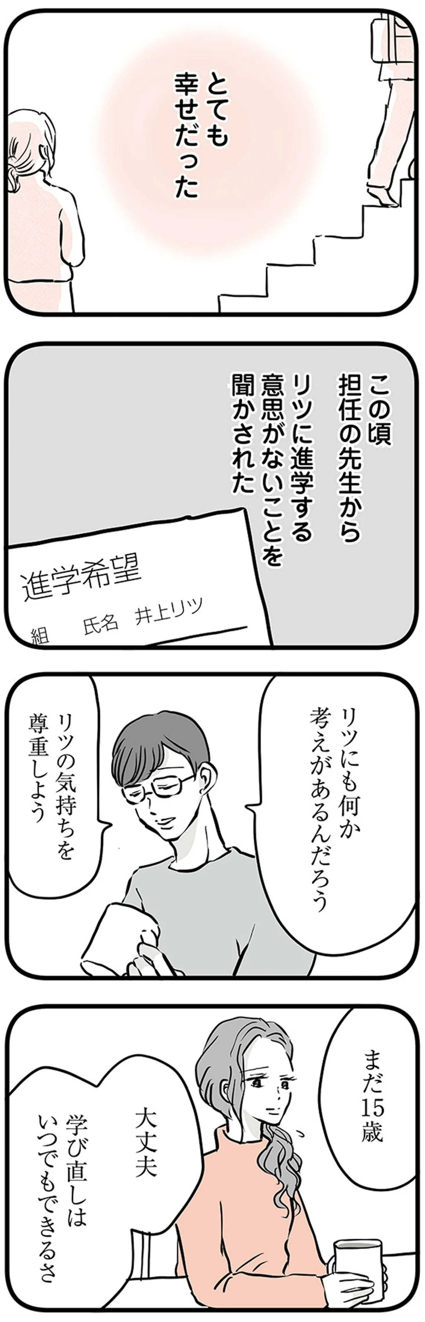 不登校が終わった中学校3年生。息子が毎日学校へ行き、家に帰ってくる幸せを噛み締める母/15歳の息子が消えた日⑩ マンガ 公開日:2025/11/10 この連載を最初から読む→ <第11回に続く> 本作品をAmazon(電子)で読む > 本作品をRenta!で読む > 本作品をebookjapanで読む > 本作品をBOOK☆WALKERで読む > « 1 2 3 あわせて読みたい 【漫画】『15歳の息子が消えた日 不登校・卒業・そして家出』を第1回から読む 【漫画】『「お母さんの言うとおり」にしてきたのに 家族全員でいじめと戦うということ。 サキコの場合』を第1回から読む 【漫画】『なんでも横取りする妹が嫌い』を読む 最新マンガと話題の書籍を無料で試し読み! 前の回 一覧 人気の連載 次の回 15歳の息子が消えた日 不登校・卒業・そして家出 (LScomic) Amazon 楽天(電子) Renta! ebookjapan ブックライブ コミックシーモア DMMブックス U-NEXT