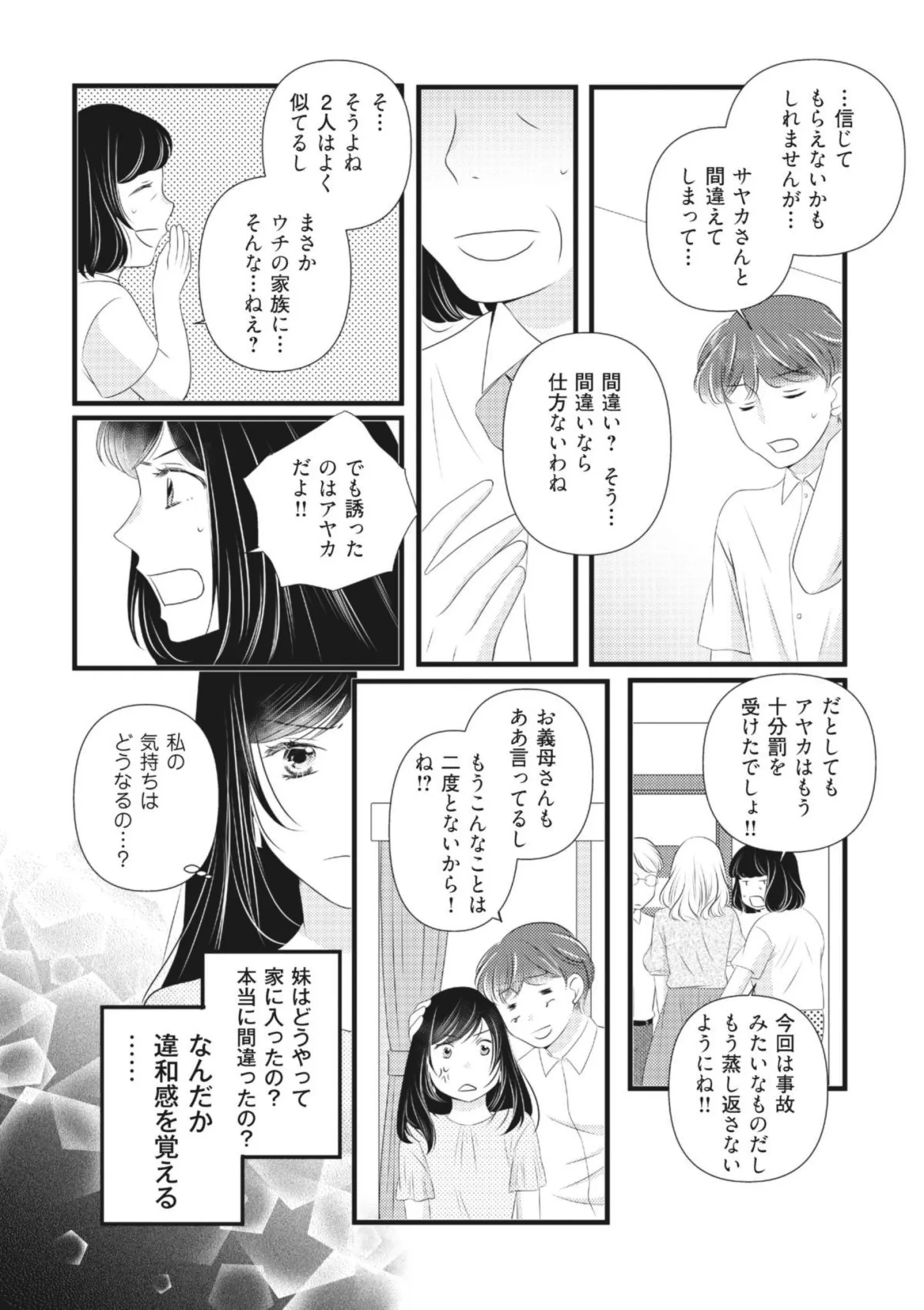 夫と妹の浮気現場に鉢合わせた妻。両親を呼んで話をするが、母は味方になってくれない/ベランダに潜む裸の女③ マンガ 公開日:2025/11/17 この連載を最初から読む→ <第4回に続く> 本作品をAmazon(電子)で読む > 本作品をRenta!で読む > 本作品をebookjapanで読む > 本作品をBOOK☆WALKERで読む > « 1 2 あわせて読みたい 【漫画】『ベランダに潜む裸の女 妹に夫も人生も奪われました』を第1回から読む 【漫画】『妻が別れを告げる時』を読む 【漫画】『ママ探偵®が明かす!浮気夫の生態とクズな男の見抜き方』を読む 最新マンガと話題の書籍を無料で試し読み! 前の回 一覧 人気の連載 次の回 ベランダに潜む裸の女 妹に夫も人生も奪われました 1 (LScomic) Amazon 楽天(電子) Renta! ebookjapan ブックライブ コミックシーモア DMMブックス U-NEXT ベランダに潜む裸の女 妹に夫も人生も奪われました 2 (LScomic) Amazon 楽天(電子) ベランダに潜む裸の女 妹に夫も人生も奪われました 3 (LScomic) Amazon 楽天(電子)