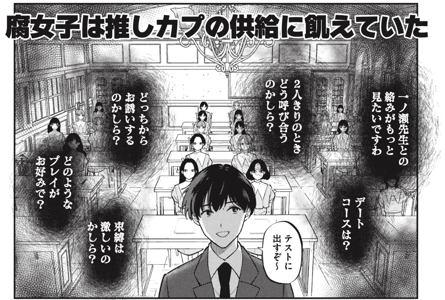 登場する生徒たちは個性豊か。男性教師の何気ない視線や会話をネタにカップリングを妄想し、授業中に推しカプの小説を文通で合作する。休み時間は性癖しりとりをして、放課後は新しい教師の出現を議題に緊急会議。国語や歴史の勉強もBLで得た知識を活用するという混沌ぶりだ。