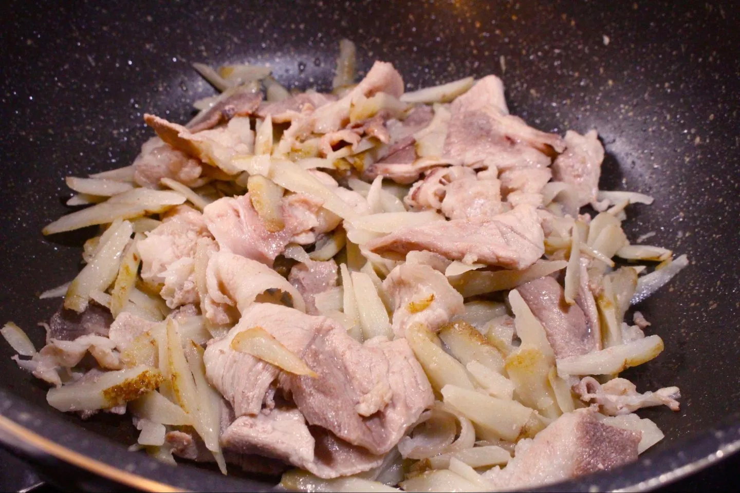 冷凍豚こまぎれ肉ときんぴらごぼう用のカット野菜を炒め、ケチャップ・中濃ソース・酒・はちみつで味付けをするだけ。こまぎれ肉は薄いので、解凍不要で使えるのが嬉しいところ。