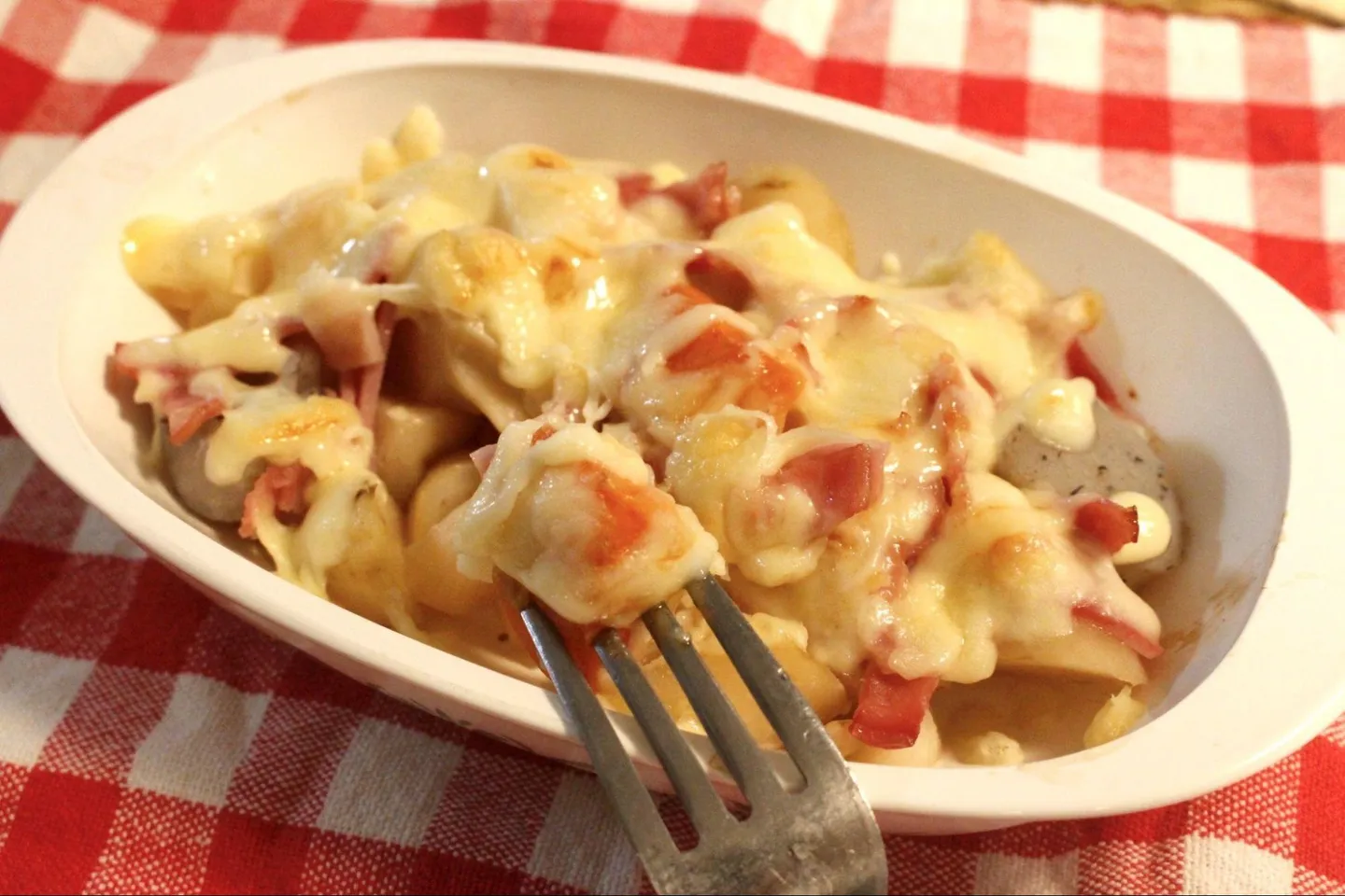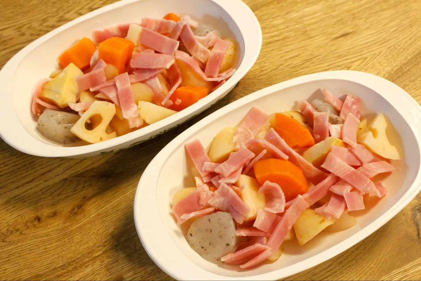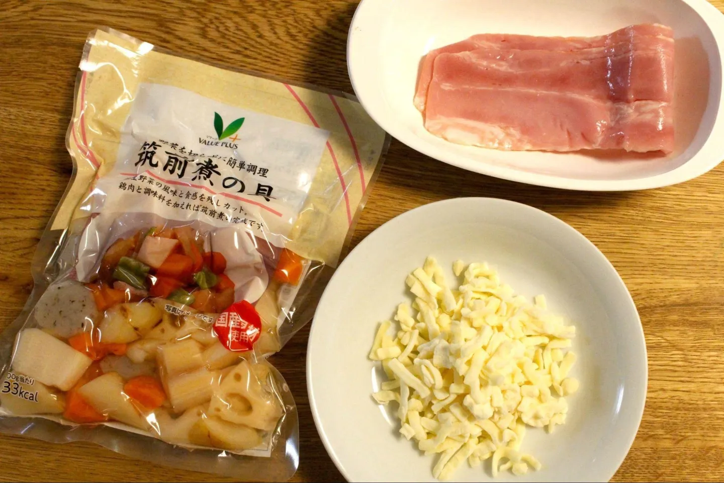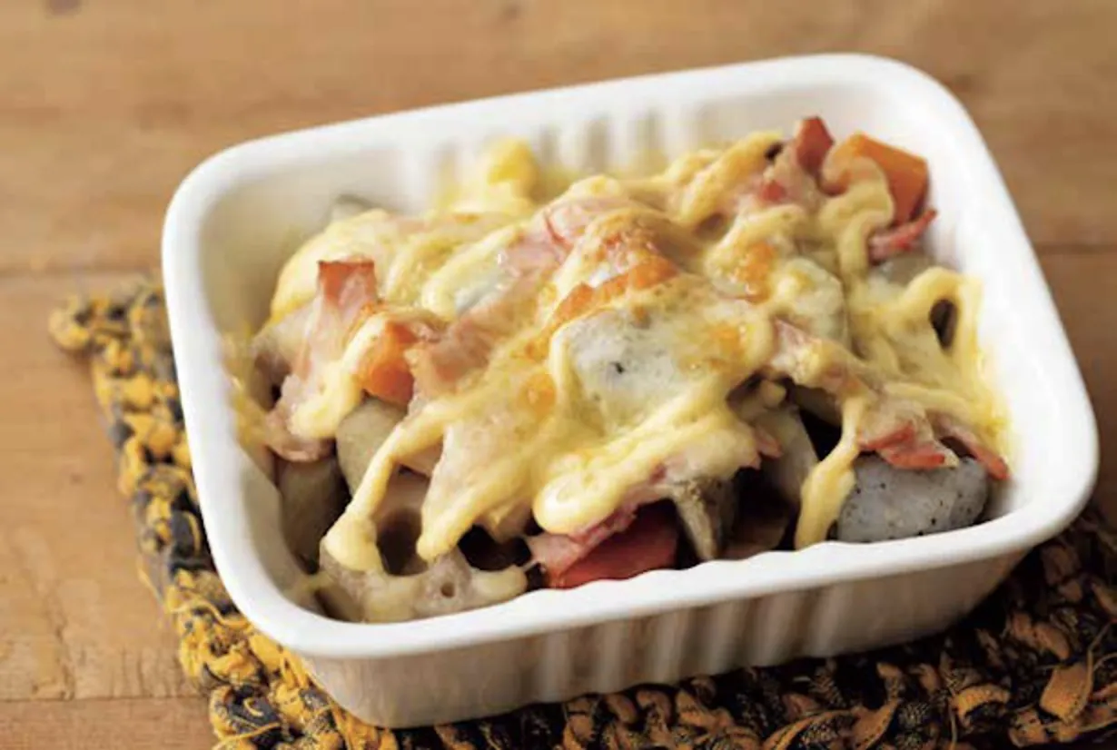 根菜系カット野菜でもう1品。5分で完成するという「根菜とベーコンのマヨチーズ焼き」を作ってみました。使うのは「筑前煮用カット野菜」。こちらも袋から出したらそのまま使えるので、耐熱皿にカット野菜とベーコンを入れ、チーズとマヨネーズをのせて4〜5分焼くだけ。