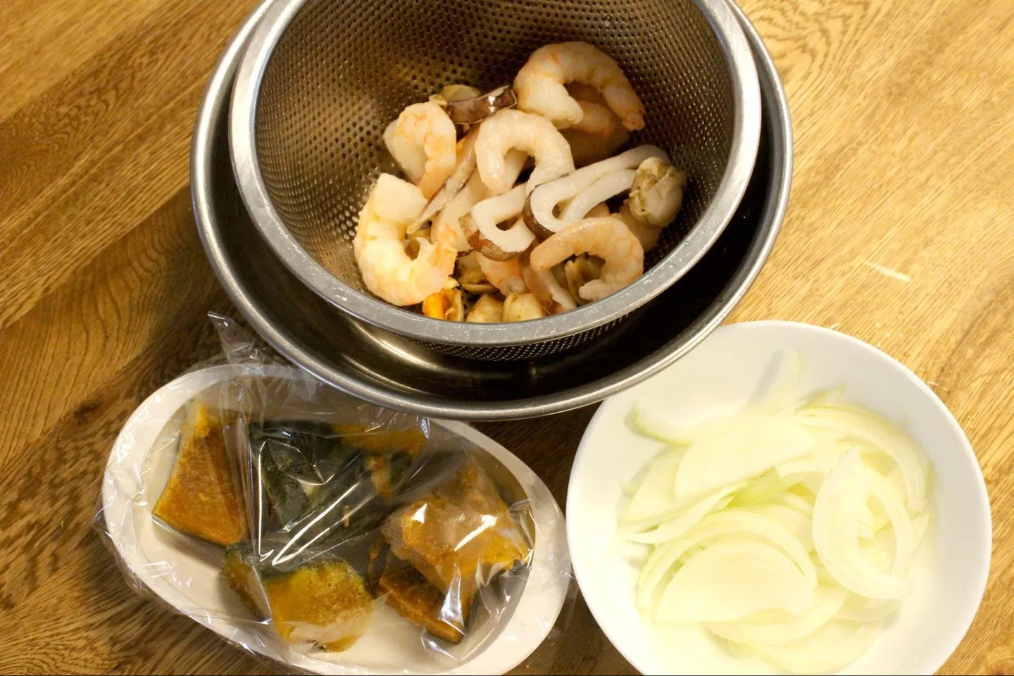 最後に紹介するのは「シーフードミックスとかぼちゃのシチュー」。「冷凍シーフード」と「冷凍かぼちゃ」を使います。どちらもそのまま使えますが、シーフードはさっと洗うのがポイント。かぼちゃはレンチンすれば、さらに時短に。