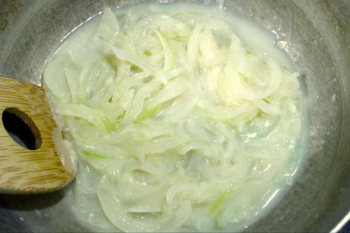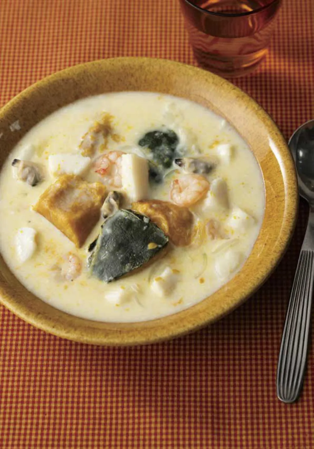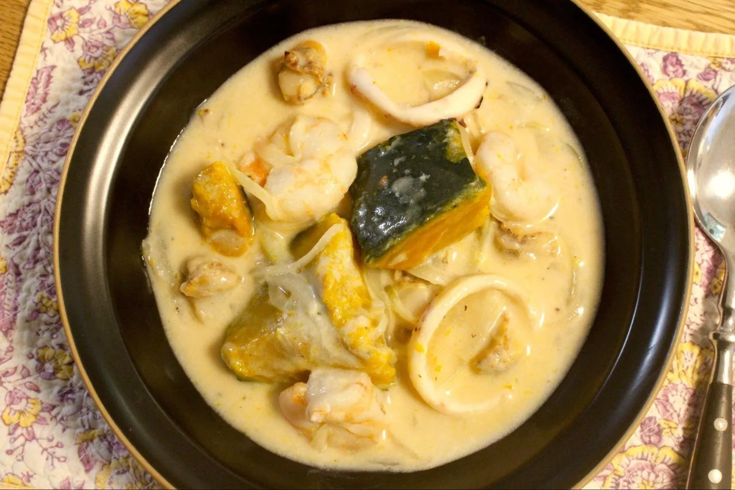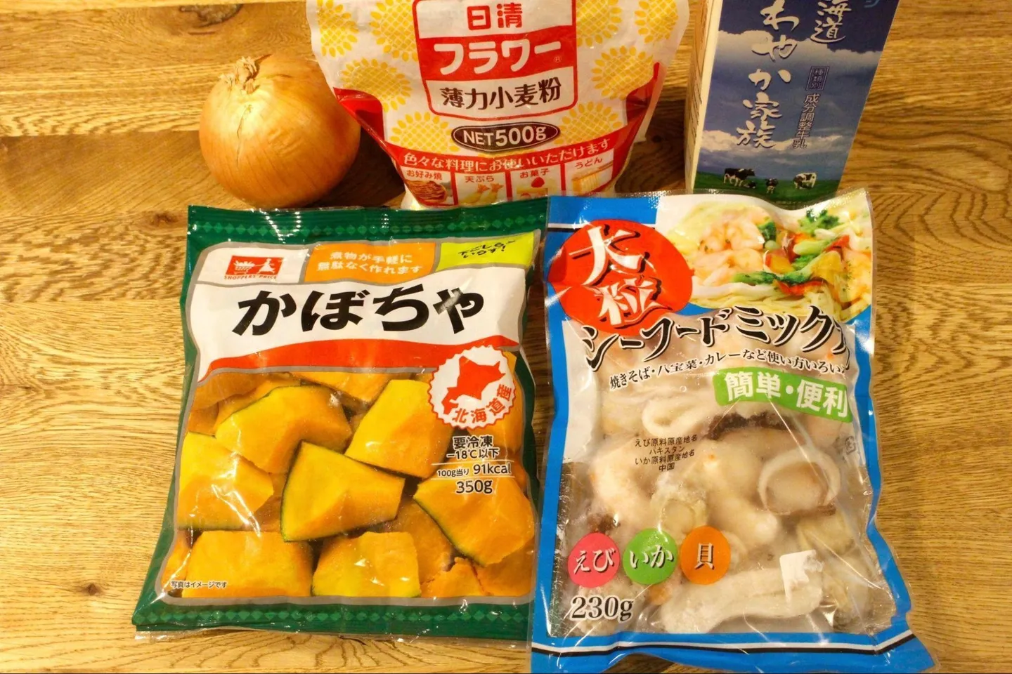 玉ねぎを炒め、小麦粉、水、牛乳、洋風スープのもと、塩コショウを順番に入れたら、シーフードとかぼちゃを入れて7〜8分煮るだけ。