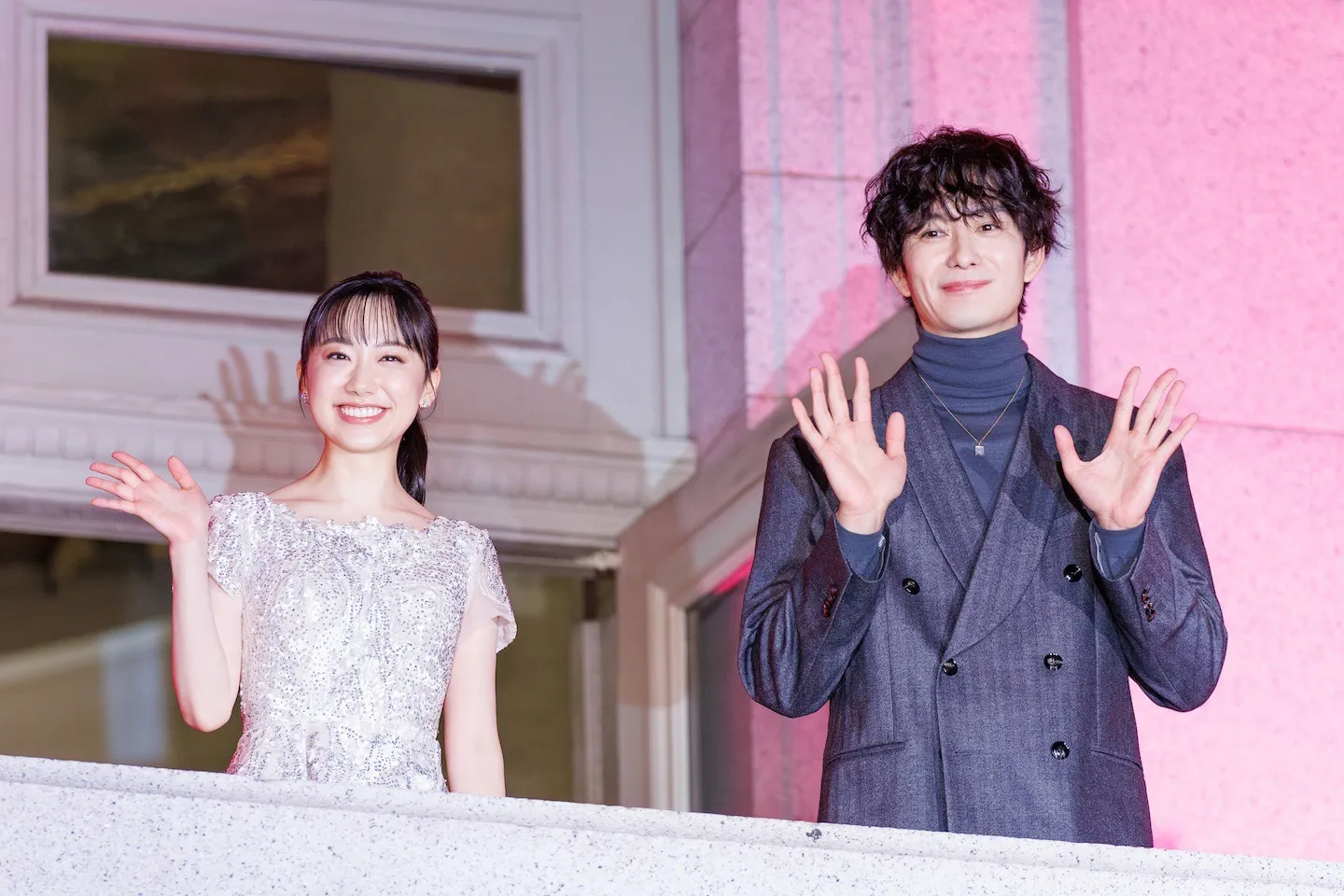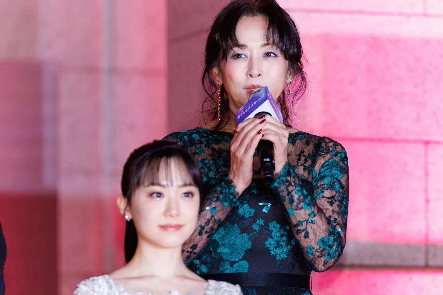 舞台挨拶が行われたのは、東京・上野にある東京国立博物館の表慶館。公開から19年経つ『時をかける少女』の舞台にもなった場所だ。レッドカーペットが敷かれ、建物全体が赤くライトアップされる中、純白のドレスで現れた芦田愛菜は主人公のスカーレットそのもの。その隣に立つ岡田将生は、スカーレットに救いの手を差し伸べる看護師・聖役を彷彿とさせる穏やかな笑顔。壮大で情熱的な本作にふさわしい光景が、公開への期待感をさらに高めていた。