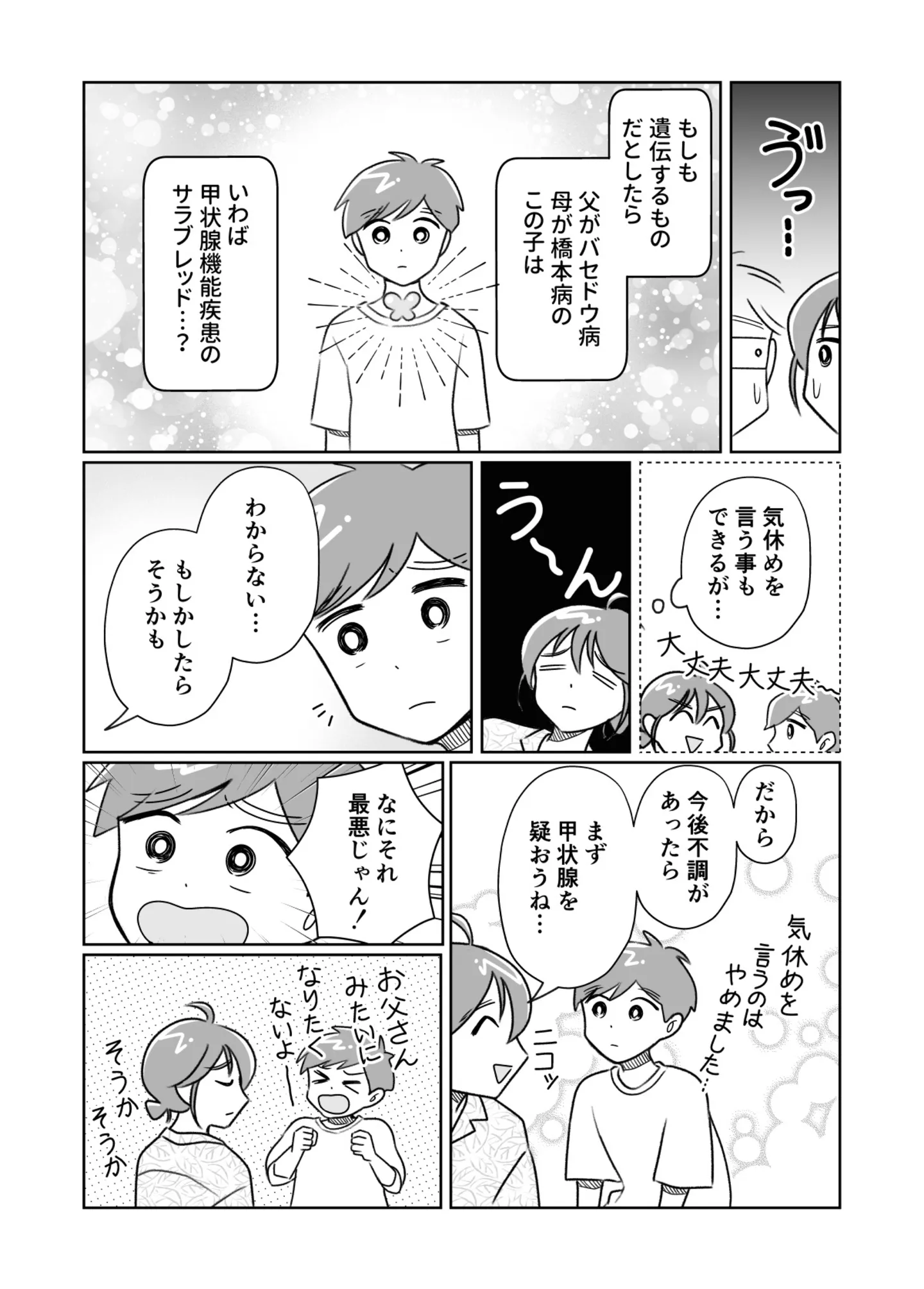 父はバセドウ病、母は橋本病。甲状腺疾患の両親を見て息子は何を思う?/夫がバセドウ病にかかったら⑥ マンガ 公開日:2025/11/28 この連載を最初から読む→ <第7回に続く> « 1 2 3 4 5 あわせて読みたい 【漫画】『夫がバセドウ病にかかったら』を読む 怠けてばかりの夫。様子がおかしくなり病院へ…バセドウ病と診断された夫と妻の7年間/夫がバセドウ病にかかったら① 市販の風邪薬はほぼ使えない。気軽に薬を買えなくなったバセドウ病男性のその後/夫がバセドウ病にかかったら⑤ こちらの話を聞かない夫にイラッ!穏やかだった男性がせっかちになった理由/夫がバセドウ病にかかったら④ 男性のバセドウ病は珍しい?表参道の専門病院へ行ってみると、そこには驚きの光景が/夫がバセドウ病にかかったら③ 最新マンガと話題の書籍を無料で試し読み! 前の回 一覧 人気の連載 次の回