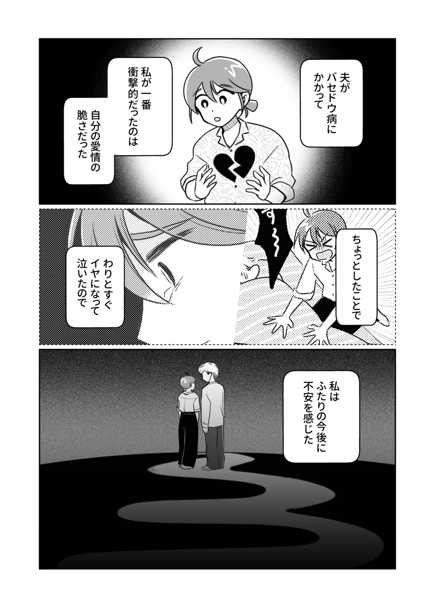 家族との良好な関係をどうやって保っていくか。闘病したからこそ気づいた大切なこと/夫がバセドウ病にかかったら⑧ マンガ 公開日:2025/12/12 この連載を最初から読む→ >> 次のページに続く « 1 2 3 > あわせて読みたい 【漫画】『夫がバセドウ病にかかったら』を読む バセドウ病治療は次なるステップへ。受けるかどうか悩んだ夫、その決断は/夫がバセドウ病にかかったら⑦ 怠けてばかりの夫。様子がおかしくなり病院へ…バセドウ病と診断された夫と妻の7年間/夫がバセドウ病にかかったら① 父はバセドウ病、母は橋本病。甲状腺疾患の両親を見て息子は何を思う?/夫がバセドウ病にかかったら⑥ 市販の風邪薬はほぼ使えない。気軽に薬を買えなくなったバセドウ病男性のその後/夫がバセドウ病にかかったら⑤ 最新マンガと話題の書籍を無料で試し読み! 前の回 一覧 人気の連載 次の回